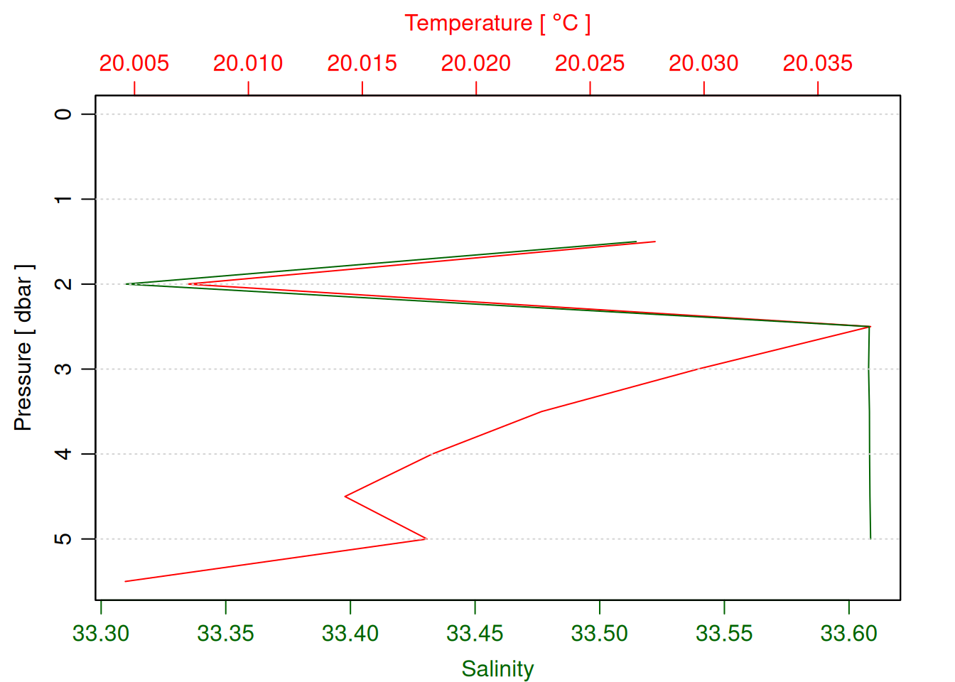 tryCatch({ oce::plotProfile(decimated_cast)# TODO: plot chl & do (prereq handle other_params in ctd_load_from_csv call above)}, error =function(e) {print("decimated cast not found")})