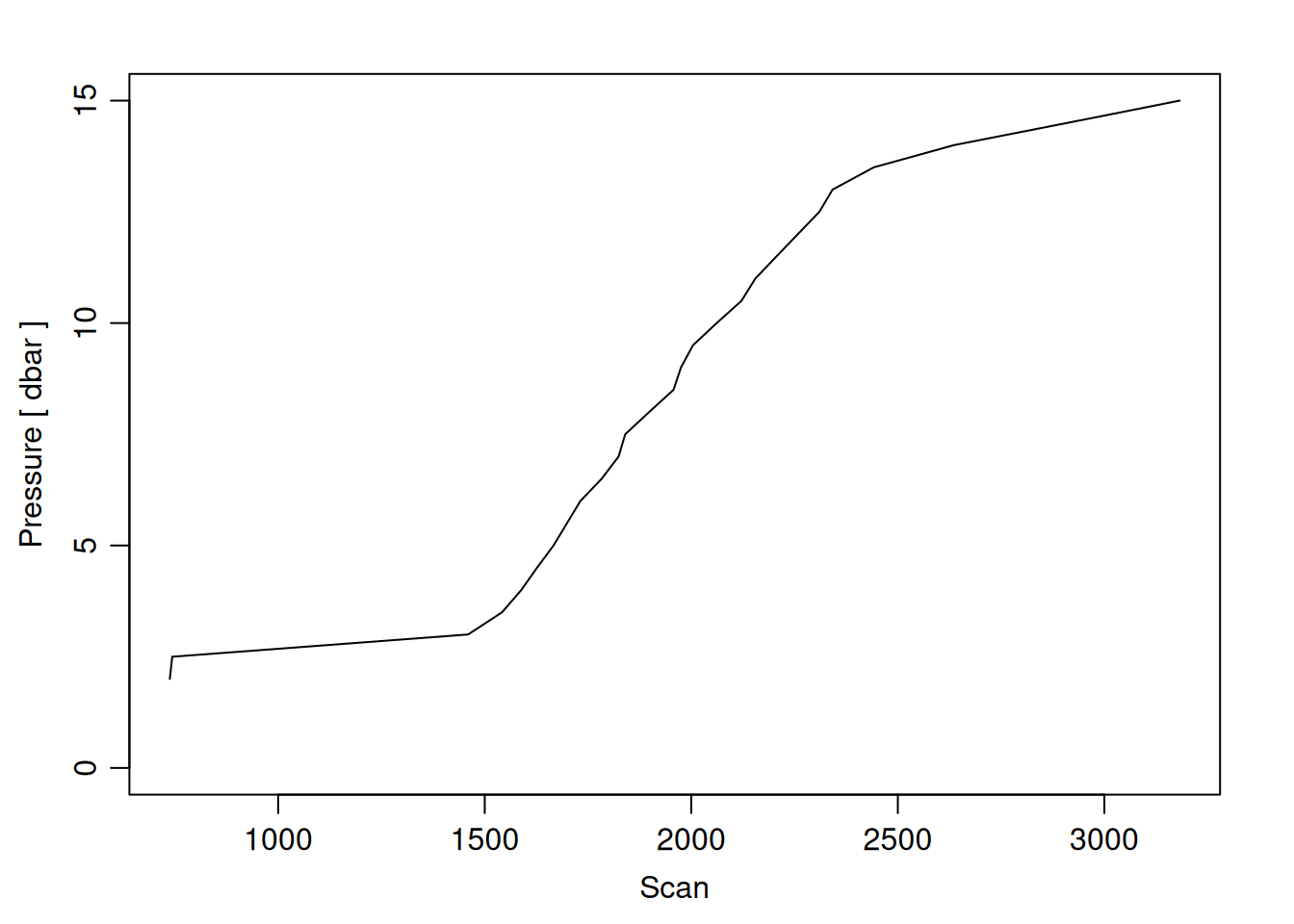 tryCatch({ trimmed_cast <-ctdTrim(cast) decimated_cast <-ctdDecimate(trimmed_cast, p =0.5)# plotting can cause the xlim failureplotScan(decimated_cast)# === export === cast_df <-as.data.frame(decimated_cast@data)# Add metadata cast_df <-mutate( cast_df,station = station_id,cruise_id = cruise_id )# drop NA rows left by cleaning cast_df <-subset(cast_df, !is.na(scan))# create folder if doesn't exist clean_data_loc <- here::here("data/02_clean")try(fs::dir_create(clean_data_loc))# save ctd to .csvwrite.csv(cast_df, glue("{clean_data_loc}/{params$cast_id}.csv"))}, error =function(e) {cat("\n=== CTD PROCESSING ERROR ===\n")cat("Cast ID:", params$cast_id, "\n")cat("Error message:\n", conditionMessage(e), "\n\n")# Safely inspect objects that might or might not exist when the error happenedif (exists("decimated_cast")) { df <-try(as.data.frame(decimated_cast@data), silent =TRUE)if (!inherits(df, "try-error")) {cat("Dataframe columns:\n")print(names(df))cat("\nSummary of key columns (scan, pressure, temperature, salinity if present):\n") known_cols <-intersect(c("scan", "pressure", "temp", "temperature", "salinity", "conductivity"), names(df))print(summary(df[known_cols], digits =3))cat("\nHead of dataframe:\n")print(head(df)) } else {cat("Could not extract dataframe from decimated_cast.\n") } } else {cat("decimated_cast was never created before the error.\n") }cat("\n=== END ERROR DEBUG INFO ===\n\n")})