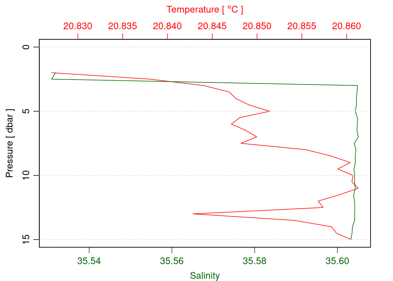 tryCatch({ oce::plotProfile(decimated_cast)# TODO: plot chl & do (prereq handle other_params in ctd_load_from_csv call above)}, error =function(e) {print("decimated cast not found")})