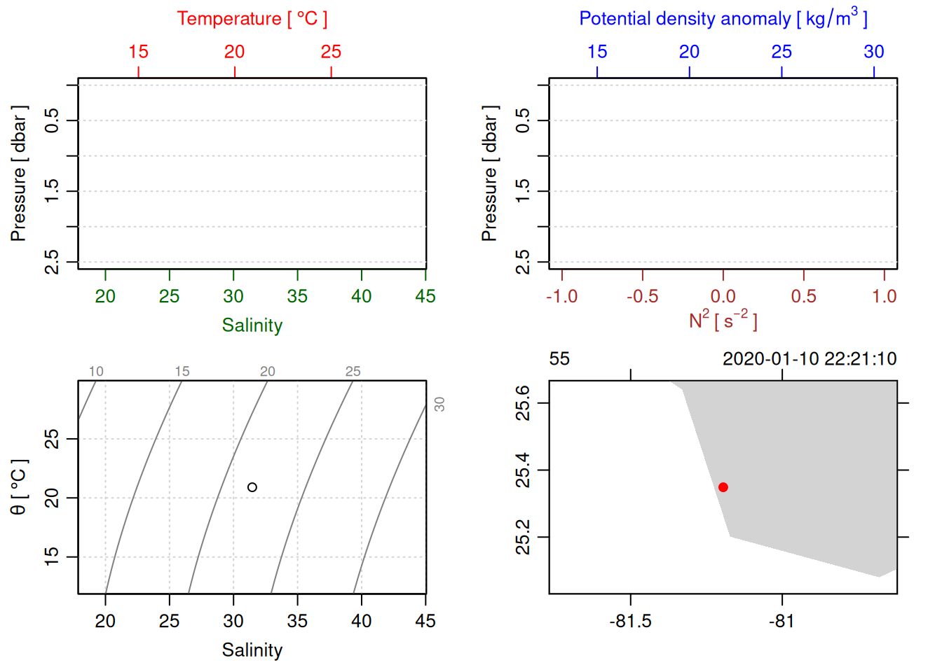 tryCatch({ trimmed_cast <-ctdTrim(cast) decimated_cast <-ctdDecimate(trimmed_cast, p =0.1)# plotting can cause the xlim failureplot(decimated_cast)# === export ===# Get the scan numbers that remain after cleaning cleaned_scans <- decimated_cast@data$scan# Load original raw data to keep all columns ctd_raw <- readr::read_csv(dataFile, show_col_types =FALSE)# Filter raw data to only include the cleaned scans cast_df <- ctd_raw %>%filter(!is.na(sea_water_pressure)) %>%# Remove rows without pressure datamutate(row_num =row_number()) %>%filter(row_num %in% cleaned_scans) %>%select(-row_num)# Add metadata cast_df <-mutate( cast_df,station = station_id,cruise_id = cruise_id )# Check if there are any rows in the cleaned dataif (nrow(cast_df) ==0) {cat("\n=== WARNING: NO DATA AFTER CLEANING ===\n")cat("Cast ID:", params$cast_id, "\n")cat("Station:", station_id, "\n")cat("Cruise:", cruise_id, "\n\n")cat("Raw data rows (with pressure):", sum(!is.na(ctd_raw$sea_water_pressure)), "\n")cat("Cleaned scans to keep:", length(cleaned_scans), "\n")cat("Resulting rows:", nrow(cast_df), "\n\n")cat("Raw data summary:\n")print(summary(ctd_raw[c("sea_water_pressure", "sea_water_temperature", "sea_water_salinity")]))cat("\nCleaned scans (first 20):\n")print(head(cleaned_scans, 20))cat("\n=== CSV FILE NOT CREATED (no data) ===\n\n") } else {# create folder if doesn't exist clean_data_loc <- here::here("data/02_clean")try(fs::dir_create(clean_data_loc))# save ctd to .csv (without row names/indices)write.csv(cast_df, glue("{clean_data_loc}/{params$cast_id}.csv"), row.names =FALSE)cat("Successfully saved", nrow(cast_df), "rows to", glue("{params$cast_id}.csv"), "\n") }}, error =function(e) {cat("\n=== CTD PROCESSING ERROR ===\n")cat("Cast ID:", params$cast_id, "\n")cat("Error message:\n", conditionMessage(e), "\n\n")# Safely inspect objects that might or might not exist when the error happenedif (exists("decimated_cast")) { df <-try(as.data.frame(decimated_cast@data), silent =TRUE)if (!inherits(df, "try-error")) {cat("Dataframe columns:\n")print(names(df))cat("\nSummary of key columns (scan, pressure, temperature, salinity if present):\n") known_cols <-intersect(c("scan", "pressure", "temp", "temperature", "salinity", "conductivity"), names(df))print(summary(df[known_cols], digits =3))cat("\nHead of dataframe:\n")print(head(df)) } else {cat("Could not extract dataframe from decimated_cast.\n") } } else {cat("decimated_cast was never created before the error.\n") }cat("\n=== END ERROR DEBUG INFO ===\n\n")})