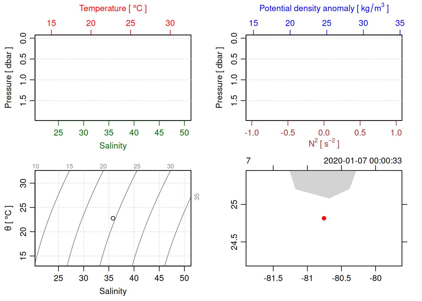 tryCatch({ trimmed_cast <-ctdTrim(cast) decimated_cast <-ctdDecimate(trimmed_cast, p =0.1)# plotting can cause the xlim failureplot(decimated_cast)# === export ===# Get the scan numbers that remain after cleaning cleaned_scans <- decimated_cast@data$scan# Load original raw data to keep all columns ctd_raw <- readr::read_csv(dataFile, show_col_types =FALSE)# Filter raw data to only include the cleaned scans cast_df <- ctd_raw %>%filter(!is.na(sea_water_pressure)) %>%# Remove rows without pressure datamutate(row_num =row_number()) %>%filter(row_num %in% cleaned_scans) %>%select(-row_num)# Add metadata cast_df <-mutate( cast_df,station = station_id,cruise_id = cruise_id )# Check if there are any rows in the cleaned dataif (nrow(cast_df) ==0) {cat("\n=== WARNING: NO DATA AFTER CLEANING ===\n")cat("Cast ID:", params$cast_id, "\n")cat("Station:", station_id, "\n")cat("Cruise:", cruise_id, "\n\n")cat("Raw data rows (with pressure):", sum(!is.na(ctd_raw$sea_water_pressure)), "\n")cat("Cleaned scans to keep:", length(cleaned_scans), "\n")cat("Resulting rows:", nrow(cast_df), "\n\n")cat("Raw data summary:\n")print(summary(ctd_raw[c("sea_water_pressure", "sea_water_temperature", "sea_water_salinity")]))cat("\nCleaned scans (first 20):\n")print(head(cleaned_scans, 20))cat("\n=== CSV FILE NOT CREATED (no data) ===\n\n") } else {# create folder if doesn't exist clean_data_loc <- here::here("data/02_clean")try(fs::dir_create(clean_data_loc))# save ctd to .csv (without row names/indices)write.csv(cast_df, glue("{clean_data_loc}/{params$cast_id}.csv"), row.names =FALSE)cat("Successfully saved", nrow(cast_df), "rows to", glue("{params$cast_id}.csv"), "\n") }}, error =function(e) {cat("\n=== CTD PROCESSING ERROR ===\n")cat("Cast ID:", params$cast_id, "\n")cat("Error message:\n", conditionMessage(e), "\n\n")# Safely inspect objects that might or might not exist when the error happenedif (exists("decimated_cast")) { df <-try(as.data.frame(decimated_cast@data), silent =TRUE)if (!inherits(df, "try-error")) {cat("Dataframe columns:\n")print(names(df))cat("\nSummary of key columns (scan, pressure, temperature, salinity if present):\n") known_cols <-intersect(c("scan", "pressure", "temp", "temperature", "salinity", "conductivity"), names(df))print(summary(df[known_cols], digits =3))cat("\nHead of dataframe:\n")print(head(df)) } else {cat("Could not extract dataframe from decimated_cast.\n") } } else {cat("decimated_cast was never created before the error.\n") }cat("\n=== END ERROR DEBUG INFO ===\n\n")})