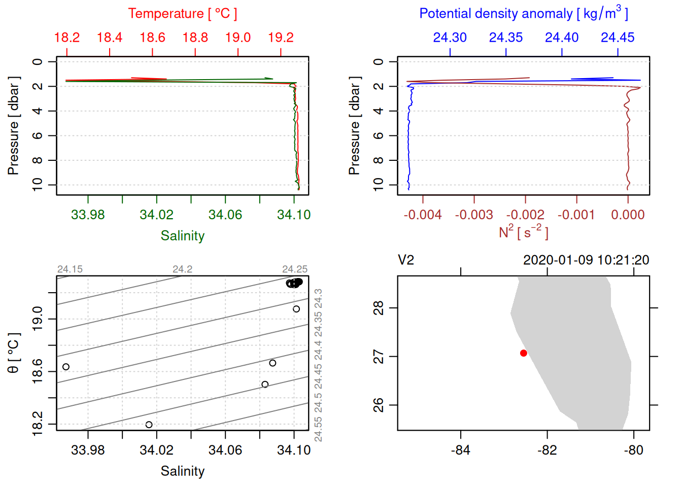 # TODO: Include param here that specifies to handle QC flags. This should be done before converting to a OCE object. QC flag columns are listed in [this spreadsheet](https://docs.google.com/spreadsheets/d/1uCxEmJRqErU-HCQiRQ1FpyiIqtNaGgMSBI0WvrtwBRU/edit?gid=137286311#gid=137286311) and are not supposed to be included in the oce object. QC param values are : # 1 good# 2 +/- 3*std_dev# 4 +/- 5*std_dev# 9 missing# Data column should be set to NA if corresponding QC column has value greater than threshold (recommended threshold is 5*std_dev).# Will need to loop through *_qc columns.# TODO: drop spikes (how? low-pass?).# TODO: combine replicate sensors (eg temp1 temp2).