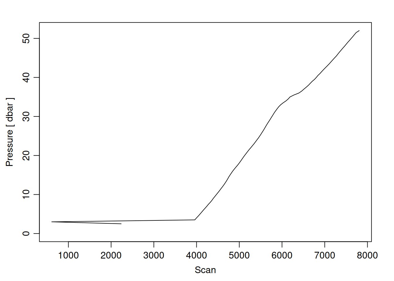 tryCatch({ trimmed_cast <-ctdTrim(cast) decimated_cast <-ctdDecimate(trimmed_cast, p =0.5)# plotting can cause the xlim failureplotScan(decimated_cast)# === export === cast_df <-as.data.frame(decimated_cast@data)# Add metadata cast_df <-mutate( cast_df,station = station_id,cruise_id = cruise_id )# drop NA rows left by cleaning cast_df <-subset(cast_df, !is.na(scan))# create folder if doesn't exist clean_data_loc <- here::here("data/02_clean")try(fs::dir_create(clean_data_loc))# save ctd to .csvwrite.csv(cast_df, glue("{clean_data_loc}/{params$cast_id}.csv"))}, error =function(e) {cat("\n=== CTD PROCESSING ERROR ===\n")cat("Cast ID:", params$cast_id, "\n")cat("Error message:\n", conditionMessage(e), "\n\n")# Safely inspect objects that might or might not exist when the error happenedif (exists("decimated_cast")) { df <-try(as.data.frame(decimated_cast@data), silent =TRUE)if (!inherits(df, "try-error")) {cat("Dataframe columns:\n")print(names(df))cat("\nSummary of key columns (scan, pressure, temperature, salinity if present):\n") known_cols <-intersect(c("scan", "pressure", "temp", "temperature", "salinity", "conductivity"), names(df))print(summary(df[known_cols], digits =3))cat("\nHead of dataframe:\n")print(head(df)) } else {cat("Could not extract dataframe from decimated_cast.\n") } } else {cat("decimated_cast was never created before the error.\n") }cat("\n=== END ERROR DEBUG INFO ===\n\n")})
