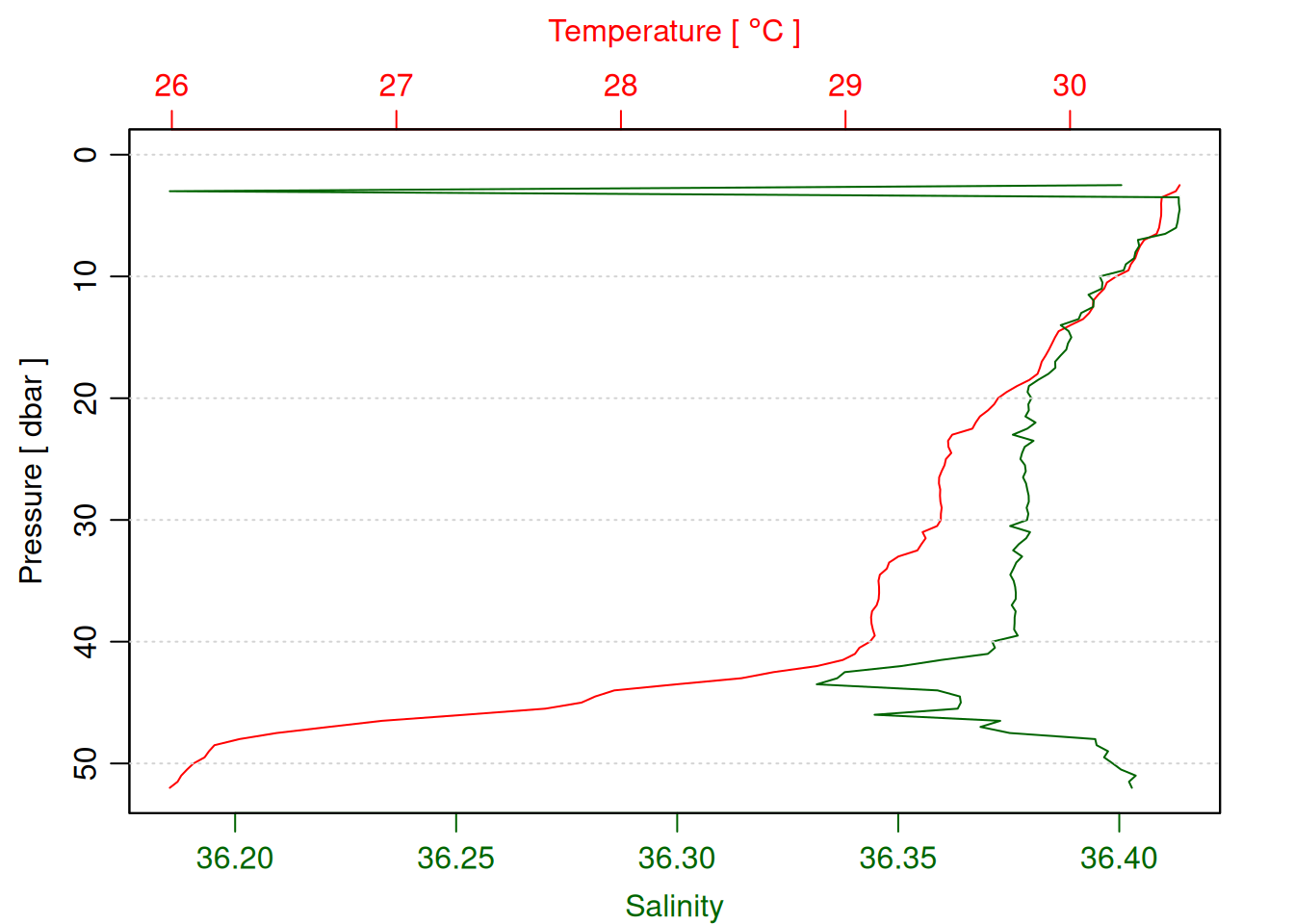 tryCatch({ oce::plotProfile(decimated_cast)# TODO: plot chl & do (prereq handle other_params in ctd_load_from_csv call above)}, error =function(e) {print("decimated cast not found")})