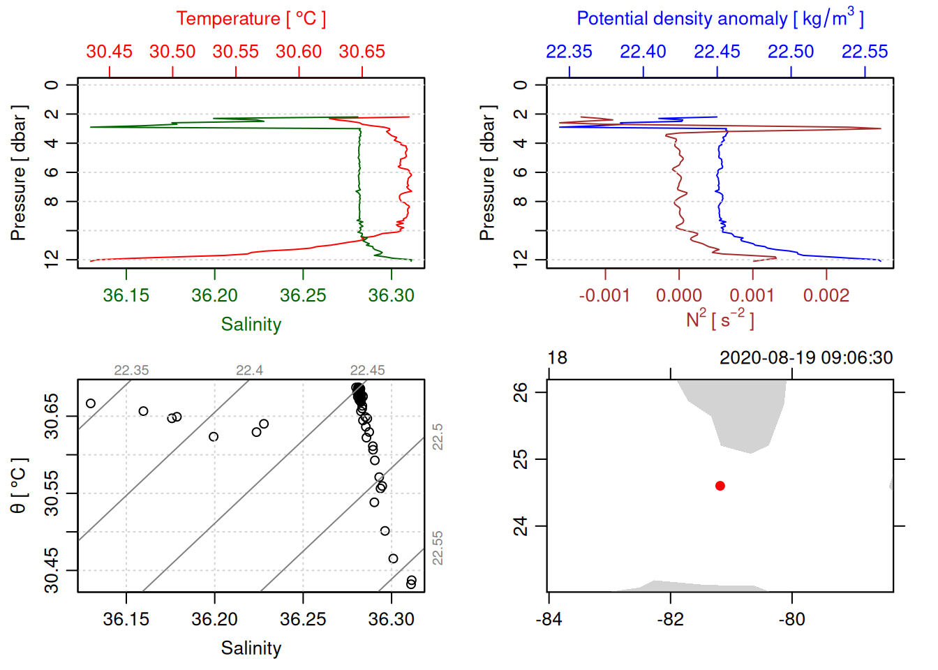 # TODO: Include param here that specifies to handle QC flags. This should be done before converting to a OCE object. QC flag columns are listed in [this spreadsheet](https://docs.google.com/spreadsheets/d/1uCxEmJRqErU-HCQiRQ1FpyiIqtNaGgMSBI0WvrtwBRU/edit?gid=137286311#gid=137286311) and are not supposed to be included in the oce object. QC param values are : # 1 good# 2 +/- 3*std_dev# 4 +/- 5*std_dev# 9 missing# Data column should be set to NA if corresponding QC column has value greater than threshold (recommended threshold is 5*std_dev).# Will need to loop through *_qc columns.# TODO: drop spikes (how? low-pass?).# TODO: combine replicate sensors (eg temp1 temp2).