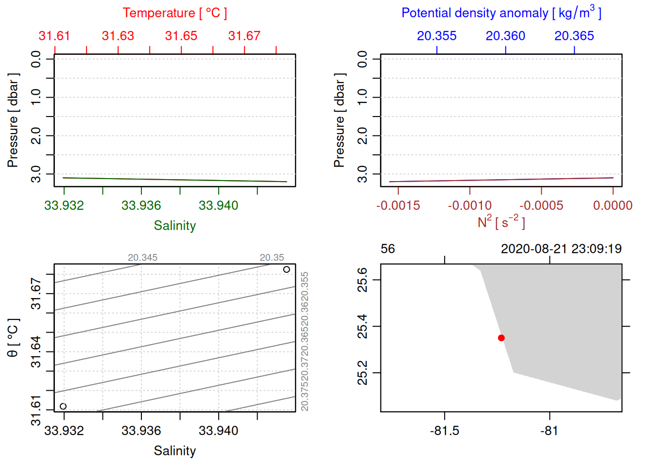 tryCatch({ trimmed_cast <-ctdTrim(cast) decimated_cast <-ctdDecimate(trimmed_cast, p =0.1)# plotting can cause the xlim failureplot(decimated_cast)# === export ===# Get the scan numbers that remain after cleaning cleaned_scans <- decimated_cast@data$scan# Load original raw data to keep all columns ctd_raw <- readr::read_csv(dataFile, show_col_types =FALSE)# Filter raw data to only include the cleaned scans cast_df <- ctd_raw %>%filter(!is.na(sea_water_pressure)) %>%# Remove rows without pressure datamutate(row_num =row_number()) %>%filter(row_num %in% cleaned_scans) %>%select(-row_num)# Add metadata cast_df <-mutate( cast_df,station = station_id,cruise_id = cruise_id )# Check if there are any rows in the cleaned dataif (nrow(cast_df) ==0) {cat("\n=== WARNING: NO DATA AFTER CLEANING ===\n")cat("Cast ID:", params$cast_id, "\n")cat("Station:", station_id, "\n")cat("Cruise:", cruise_id, "\n\n")cat("Raw data rows (with pressure):", sum(!is.na(ctd_raw$sea_water_pressure)), "\n")cat("Cleaned scans to keep:", length(cleaned_scans), "\n")cat("Resulting rows:", nrow(cast_df), "\n\n")cat("Raw data summary:\n")print(summary(ctd_raw[c("sea_water_pressure", "sea_water_temperature", "sea_water_salinity")]))cat("\nCleaned scans (first 20):\n")print(head(cleaned_scans, 20))cat("\n=== CSV FILE NOT CREATED (no data) ===\n\n") } else {# create folder if doesn't exist clean_data_loc <- here::here("data/02_clean")try(fs::dir_create(clean_data_loc))# save ctd to .csv (without row names/indices)write.csv(cast_df, glue("{clean_data_loc}/{params$cast_id}.csv"), row.names =FALSE)cat("Successfully saved", nrow(cast_df), "rows to", glue("{params$cast_id}.csv"), "\n") }}, error =function(e) {cat("\n=== CTD PROCESSING ERROR ===\n")cat("Cast ID:", params$cast_id, "\n")cat("Error message:\n", conditionMessage(e), "\n\n")# Safely inspect objects that might or might not exist when the error happenedif (exists("decimated_cast")) { df <-try(as.data.frame(decimated_cast@data), silent =TRUE)if (!inherits(df, "try-error")) {cat("Dataframe columns:\n")print(names(df))cat("\nSummary of key columns (scan, pressure, temperature, salinity if present):\n") known_cols <-intersect(c("scan", "pressure", "temp", "temperature", "salinity", "conductivity"), names(df))print(summary(df[known_cols], digits =3))cat("\nHead of dataframe:\n")print(head(df)) } else {cat("Could not extract dataframe from decimated_cast.\n") } } else {cat("decimated_cast was never created before the error.\n") }cat("\n=== END ERROR DEBUG INFO ===\n\n")})