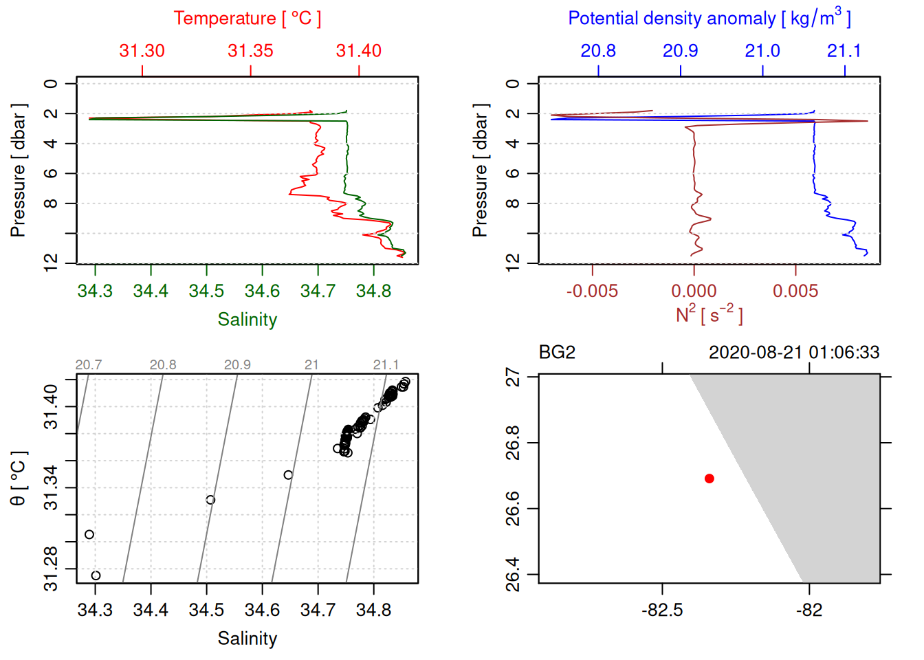 # TODO: Include param here that specifies to handle QC flags. This should be done before converting to a OCE object. QC flag columns are listed in [this spreadsheet](https://docs.google.com/spreadsheets/d/1uCxEmJRqErU-HCQiRQ1FpyiIqtNaGgMSBI0WvrtwBRU/edit?gid=137286311#gid=137286311) and are not supposed to be included in the oce object. QC param values are : # 1 good# 2 +/- 3*std_dev# 4 +/- 5*std_dev# 9 missing# Data column should be set to NA if corresponding QC column has value greater than threshold (recommended threshold is 5*std_dev).# Will need to loop through *_qc columns.# TODO: drop spikes (how? low-pass?).# TODO: combine replicate sensors (eg temp1 temp2).