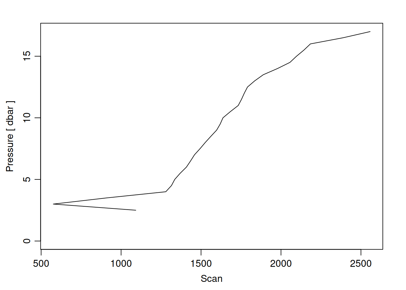 tryCatch({ trimmed_cast <-ctdTrim(cast) decimated_cast <-ctdDecimate(trimmed_cast, p =0.5)# plotting can cause the xlim failureplotScan(decimated_cast)# === export === cast_df <-as.data.frame(decimated_cast@data)# Add metadata cast_df <-mutate( cast_df,station = station_id,cruise_id = cruise_id )# drop NA rows left by cleaning cast_df <-subset(cast_df, !is.na(scan))# create folder if doesn't exist clean_data_loc <- here::here("data/02_clean")try(fs::dir_create(clean_data_loc))# save ctd to .csvwrite.csv(cast_df, glue("{clean_data_loc}/{params$cast_id}.csv"))}, error =function(e) {cat("\n=== CTD PROCESSING ERROR ===\n")cat("Cast ID:", params$cast_id, "\n")cat("Error message:\n", conditionMessage(e), "\n\n")# Safely inspect objects that might or might not exist when the error happenedif (exists("decimated_cast")) { df <-try(as.data.frame(decimated_cast@data), silent =TRUE)if (!inherits(df, "try-error")) {cat("Dataframe columns:\n")print(names(df))cat("\nSummary of key columns (scan, pressure, temperature, salinity if present):\n") known_cols <-intersect(c("scan", "pressure", "temp", "temperature", "salinity", "conductivity"), names(df))print(summary(df[known_cols], digits =3))cat("\nHead of dataframe:\n")print(head(df)) } else {cat("Could not extract dataframe from decimated_cast.\n") } } else {cat("decimated_cast was never created before the error.\n") }cat("\n=== END ERROR DEBUG INFO ===\n\n")})