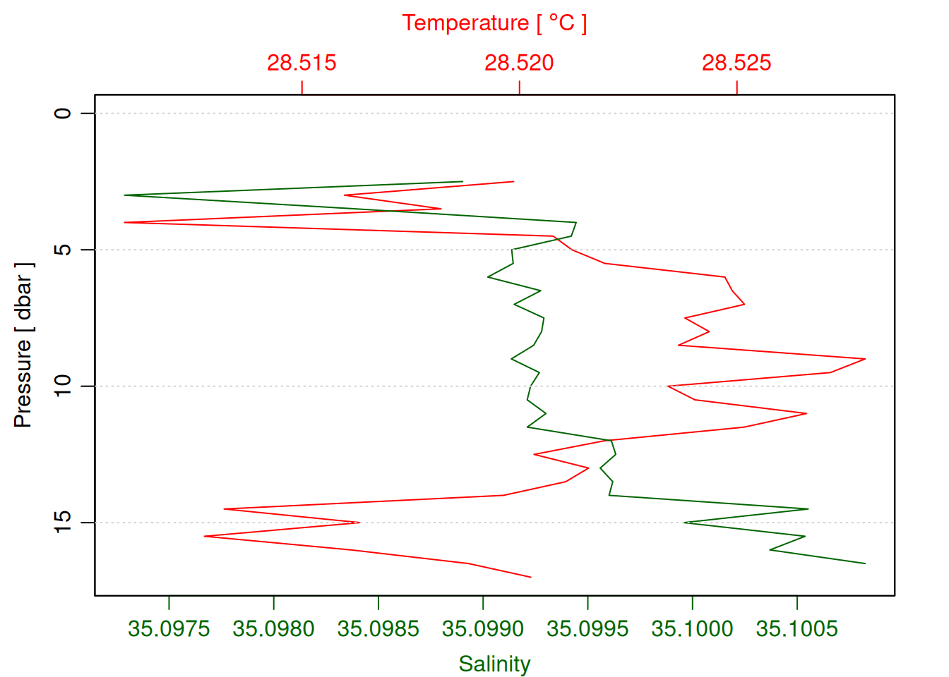 tryCatch({ oce::plotProfile(decimated_cast)# TODO: plot chl & do (prereq handle other_params in ctd_load_from_csv call above)}, error =function(e) {print("decimated cast not found")})