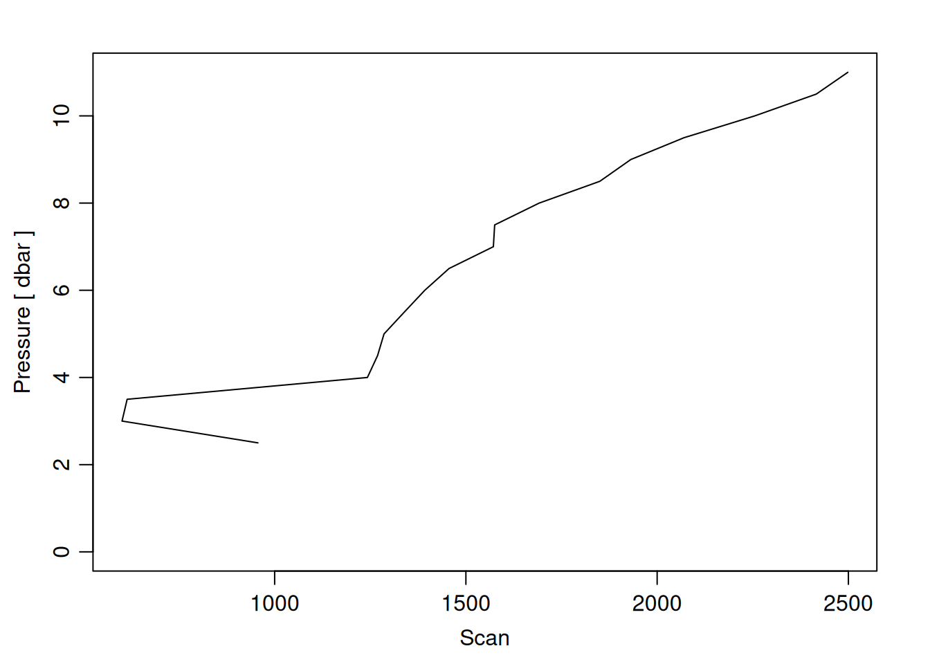 tryCatch({ trimmed_cast <-ctdTrim(cast) decimated_cast <-ctdDecimate(trimmed_cast, p =0.5)# plotting can cause the xlim failureplotScan(decimated_cast)# === export === cast_df <-as.data.frame(decimated_cast@data)# Add metadata cast_df <-mutate( cast_df,station = station_id,cruise_id = cruise_id )# drop NA rows left by cleaning cast_df <-subset(cast_df, !is.na(scan))# create folder if doesn't exist clean_data_loc <- here::here("data/02_clean")try(fs::dir_create(clean_data_loc))# save ctd to .csvwrite.csv(cast_df, glue("{clean_data_loc}/{params$cast_id}.csv"))}, error =function(e) {cat("\n=== CTD PROCESSING ERROR ===\n")cat("Cast ID:", params$cast_id, "\n")cat("Error message:\n", conditionMessage(e), "\n\n")# Safely inspect objects that might or might not exist when the error happenedif (exists("decimated_cast")) { df <-try(as.data.frame(decimated_cast@data), silent =TRUE)if (!inherits(df, "try-error")) {cat("Dataframe columns:\n")print(names(df))cat("\nSummary of key columns (scan, pressure, temperature, salinity if present):\n") known_cols <-intersect(c("scan", "pressure", "temp", "temperature", "salinity", "conductivity"), names(df))print(summary(df[known_cols], digits =3))cat("\nHead of dataframe:\n")print(head(df)) } else {cat("Could not extract dataframe from decimated_cast.\n") } } else {cat("decimated_cast was never created before the error.\n") }cat("\n=== END ERROR DEBUG INFO ===\n\n")})