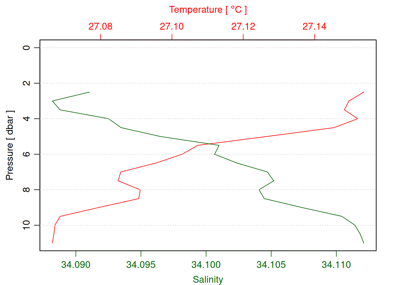 tryCatch({ oce::plotProfile(decimated_cast)# TODO: plot chl & do (prereq handle other_params in ctd_load_from_csv call above)}, error =function(e) {print("decimated cast not found")})