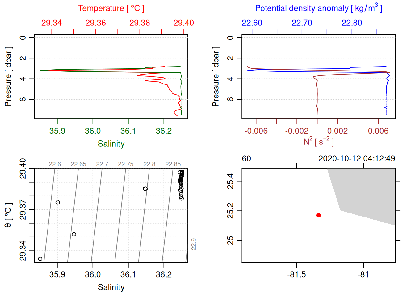 # TODO: Include param here that specifies to handle QC flags. This should be done before converting to a OCE object. QC flag columns are listed in [this spreadsheet](https://docs.google.com/spreadsheets/d/1uCxEmJRqErU-HCQiRQ1FpyiIqtNaGgMSBI0WvrtwBRU/edit?gid=137286311#gid=137286311) and are not supposed to be included in the oce object. QC param values are : # 1 good# 2 +/- 3*std_dev# 4 +/- 5*std_dev# 9 missing# Data column should be set to NA if corresponding QC column has value greater than threshold (recommended threshold is 5*std_dev).# Will need to loop through *_qc columns.# TODO: drop spikes (how? low-pass?).# TODO: combine replicate sensors (eg temp1 temp2).
