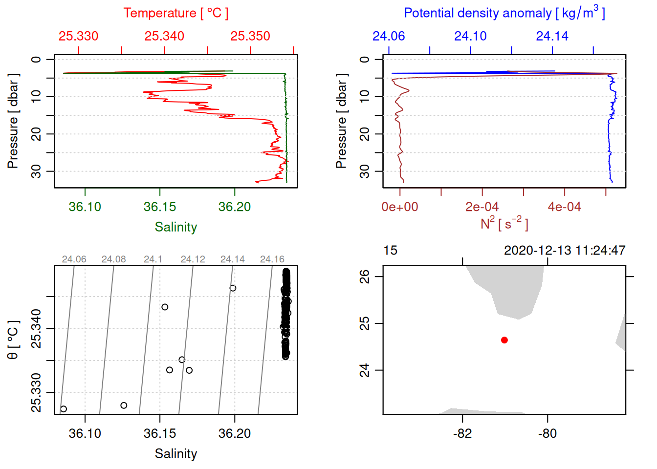 tryCatch({ trimmed_cast <-ctdTrim(cast) decimated_cast <-ctdDecimate(trimmed_cast, p =0.1)# plotting can cause the xlim failureplot(decimated_cast)# === export ===# Get the scan numbers that remain after cleaning cleaned_scans <- decimated_cast@data$scan# Load original raw data to keep all columns ctd_raw <- readr::read_csv(dataFile, show_col_types =FALSE)# Filter raw data to only include the cleaned scans cast_df <- ctd_raw %>%filter(!is.na(sea_water_pressure)) %>%# Remove rows without pressure datamutate(row_num =row_number()) %>%filter(row_num %in% cleaned_scans) %>%select(-row_num)# Add metadata cast_df <-mutate( cast_df,station = station_id,cruise_id = cruise_id )# Check if there are any rows in the cleaned dataif (nrow(cast_df) ==0) {cat("\n=== WARNING: NO DATA AFTER CLEANING ===\n")cat("Cast ID:", params$cast_id, "\n")cat("Station:", station_id, "\n")cat("Cruise:", cruise_id, "\n\n")cat("Raw data rows (with pressure):", sum(!is.na(ctd_raw$sea_water_pressure)), "\n")cat("Cleaned scans to keep:", length(cleaned_scans), "\n")cat("Resulting rows:", nrow(cast_df), "\n\n")cat("Raw data summary:\n")print(summary(ctd_raw[c("sea_water_pressure", "sea_water_temperature", "sea_water_salinity")]))cat("\nCleaned scans (first 20):\n")print(head(cleaned_scans, 20))cat("\n=== CSV FILE NOT CREATED (no data) ===\n\n") } else {# create folder if doesn't exist clean_data_loc <- here::here("data/02_clean")try(fs::dir_create(clean_data_loc))# save ctd to .csv (without row names/indices)write.csv(cast_df, glue("{clean_data_loc}/{params$cast_id}.csv"), row.names =FALSE)cat("Successfully saved", nrow(cast_df), "rows to", glue("{params$cast_id}.csv"), "\n") }}, error =function(e) {cat("\n=== CTD PROCESSING ERROR ===\n")cat("Cast ID:", params$cast_id, "\n")cat("Error message:\n", conditionMessage(e), "\n\n")# Safely inspect objects that might or might not exist when the error happenedif (exists("decimated_cast")) { df <-try(as.data.frame(decimated_cast@data), silent =TRUE)if (!inherits(df, "try-error")) {cat("Dataframe columns:\n")print(names(df))cat("\nSummary of key columns (scan, pressure, temperature, salinity if present):\n") known_cols <-intersect(c("scan", "pressure", "temp", "temperature", "salinity", "conductivity"), names(df))print(summary(df[known_cols], digits =3))cat("\nHead of dataframe:\n")print(head(df)) } else {cat("Could not extract dataframe from decimated_cast.\n") } } else {cat("decimated_cast was never created before the error.\n") }cat("\n=== END ERROR DEBUG INFO ===\n\n")})