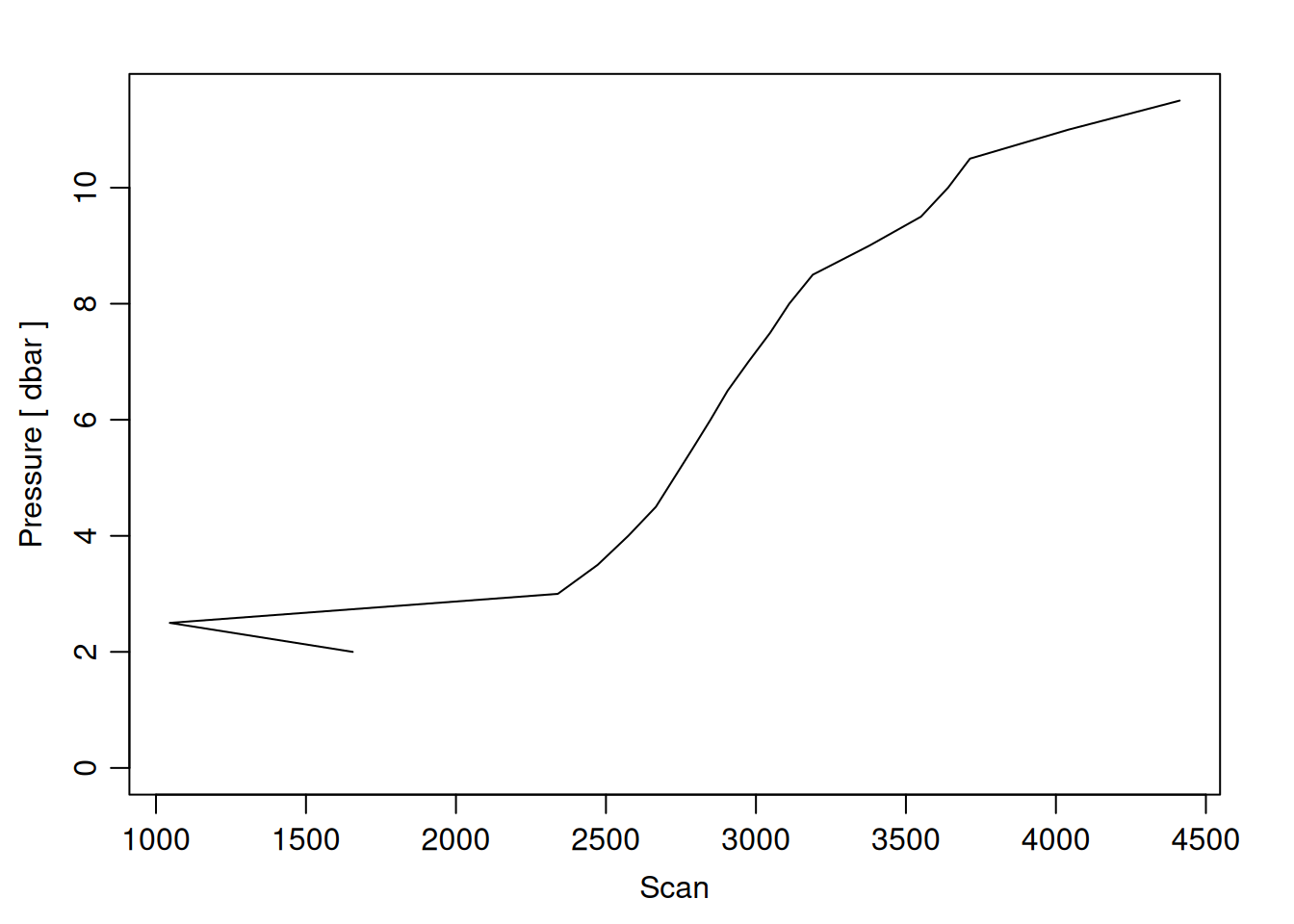 tryCatch({ trimmed_cast <-ctdTrim(cast) decimated_cast <-ctdDecimate(trimmed_cast, p =0.5)# plotting can cause the xlim failureplotScan(decimated_cast)# === export === cast_df <-as.data.frame(decimated_cast@data)# Add metadata cast_df <-mutate( cast_df,station = station_id,cruise_id = cruise_id )# drop NA rows left by cleaning cast_df <-subset(cast_df, !is.na(scan))# create folder if doesn't exist clean_data_loc <- here::here("data/02_clean")try(fs::dir_create(clean_data_loc))# save ctd to .csvwrite.csv(cast_df, glue("{clean_data_loc}/{params$cast_id}.csv"))}, error =function(e) {cat("\n=== CTD PROCESSING ERROR ===\n")cat("Cast ID:", params$cast_id, "\n")cat("Error message:\n", conditionMessage(e), "\n\n")# Safely inspect objects that might or might not exist when the error happenedif (exists("decimated_cast")) { df <-try(as.data.frame(decimated_cast@data), silent =TRUE)if (!inherits(df, "try-error")) {cat("Dataframe columns:\n")print(names(df))cat("\nSummary of key columns (scan, pressure, temperature, salinity if present):\n") known_cols <-intersect(c("scan", "pressure", "temp", "temperature", "salinity", "conductivity"), names(df))print(summary(df[known_cols], digits =3))cat("\nHead of dataframe:\n")print(head(df)) } else {cat("Could not extract dataframe from decimated_cast.\n") } } else {cat("decimated_cast was never created before the error.\n") }cat("\n=== END ERROR DEBUG INFO ===\n\n")})