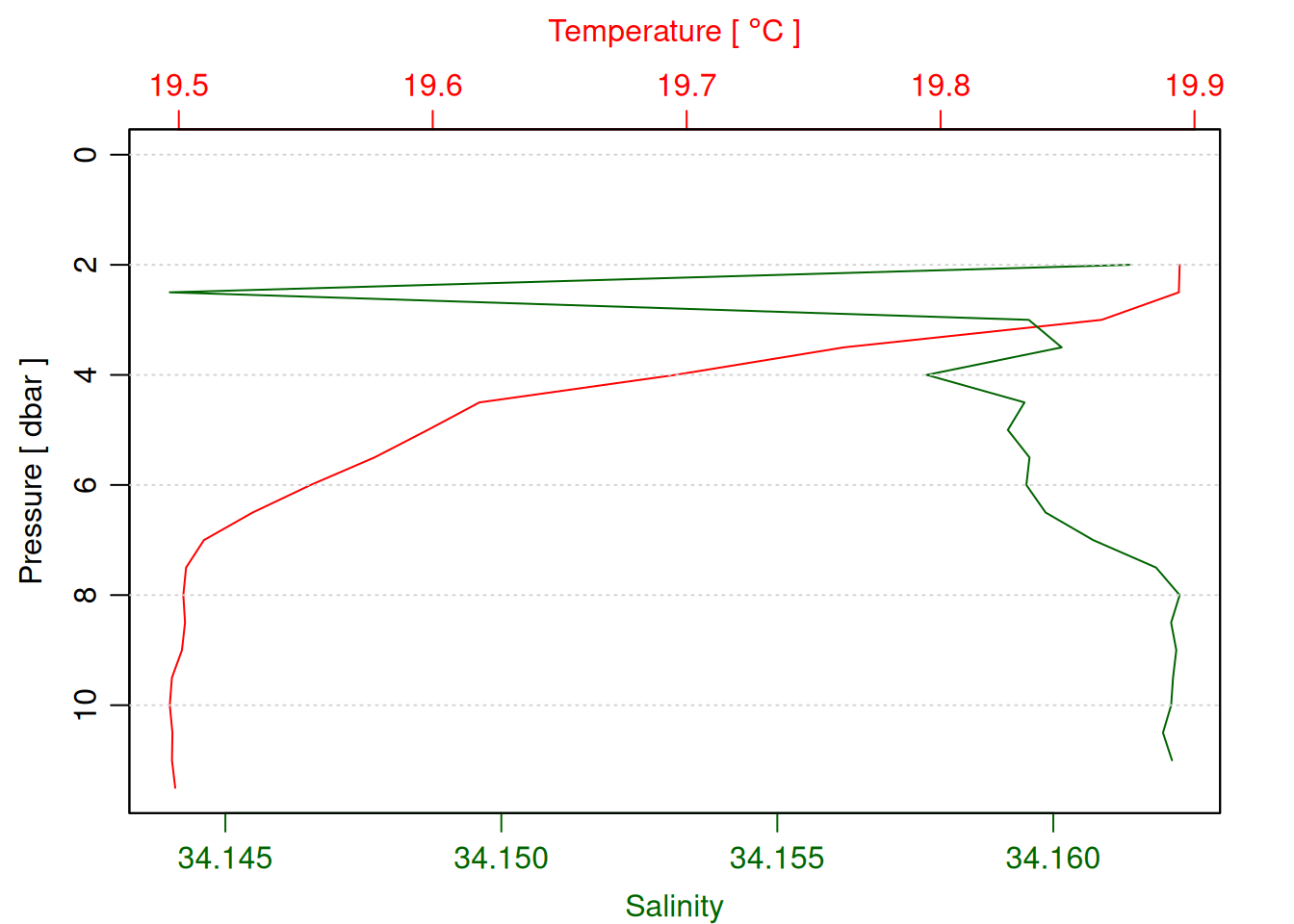 tryCatch({ oce::plotProfile(decimated_cast)# TODO: plot chl & do (prereq handle other_params in ctd_load_from_csv call above)}, error =function(e) {print("decimated cast not found")})