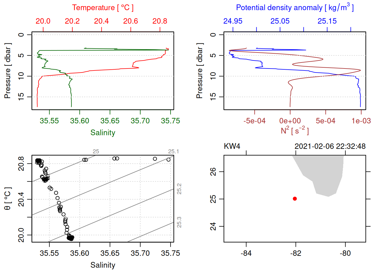 tryCatch({ trimmed_cast <-ctdTrim(cast) decimated_cast <-ctdDecimate(trimmed_cast, p =0.1)# plotting can cause the xlim failureplot(decimated_cast)# === export ===# Get the scan numbers that remain after cleaning cleaned_scans <- decimated_cast@data$scan# Load original raw data to keep all columns ctd_raw <- readr::read_csv(dataFile, show_col_types =FALSE)# Filter raw data to only include the cleaned scans cast_df <- ctd_raw %>%filter(!is.na(sea_water_pressure)) %>%# Remove rows without pressure datamutate(row_num =row_number()) %>%filter(row_num %in% cleaned_scans) %>%select(-row_num)# Add metadata cast_df <-mutate( cast_df,station = station_id,cruise_id = cruise_id )# Check if there are any rows in the cleaned dataif (nrow(cast_df) ==0) {cat("\n=== WARNING: NO DATA AFTER CLEANING ===\n")cat("Cast ID:", params$cast_id, "\n")cat("Station:", station_id, "\n")cat("Cruise:", cruise_id, "\n\n")cat("Raw data rows (with pressure):", sum(!is.na(ctd_raw$sea_water_pressure)), "\n")cat("Cleaned scans to keep:", length(cleaned_scans), "\n")cat("Resulting rows:", nrow(cast_df), "\n\n")cat("Raw data summary:\n")print(summary(ctd_raw[c("sea_water_pressure", "sea_water_temperature", "sea_water_salinity")]))cat("\nCleaned scans (first 20):\n")print(head(cleaned_scans, 20))cat("\n=== CSV FILE NOT CREATED (no data) ===\n\n") } else {# create folder if doesn't exist clean_data_loc <- here::here("data/02_clean")try(fs::dir_create(clean_data_loc))# save ctd to .csv (without row names/indices)write.csv(cast_df, glue("{clean_data_loc}/{params$cast_id}.csv"), row.names =FALSE)cat("Successfully saved", nrow(cast_df), "rows to", glue("{params$cast_id}.csv"), "\n") }}, error =function(e) {cat("\n=== CTD PROCESSING ERROR ===\n")cat("Cast ID:", params$cast_id, "\n")cat("Error message:\n", conditionMessage(e), "\n\n")# Safely inspect objects that might or might not exist when the error happenedif (exists("decimated_cast")) { df <-try(as.data.frame(decimated_cast@data), silent =TRUE)if (!inherits(df, "try-error")) {cat("Dataframe columns:\n")print(names(df))cat("\nSummary of key columns (scan, pressure, temperature, salinity if present):\n") known_cols <-intersect(c("scan", "pressure", "temp", "temperature", "salinity", "conductivity"), names(df))print(summary(df[known_cols], digits =3))cat("\nHead of dataframe:\n")print(head(df)) } else {cat("Could not extract dataframe from decimated_cast.\n") } } else {cat("decimated_cast was never created before the error.\n") }cat("\n=== END ERROR DEBUG INFO ===\n\n")})