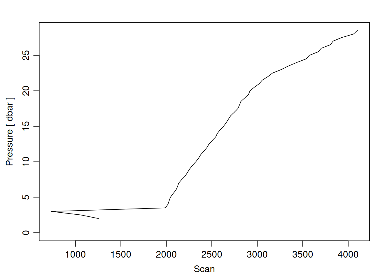tryCatch({ trimmed_cast <-ctdTrim(cast) decimated_cast <-ctdDecimate(trimmed_cast, p =0.5)# plotting can cause the xlim failureplotScan(decimated_cast)# === export === cast_df <-as.data.frame(decimated_cast@data)# Add metadata cast_df <-mutate( cast_df,station = station_id,cruise_id = cruise_id )# drop NA rows left by cleaning cast_df <-subset(cast_df, !is.na(scan))# create folder if doesn't exist clean_data_loc <- here::here("data/02_clean")try(fs::dir_create(clean_data_loc))# save ctd to .csvwrite.csv(cast_df, glue("{clean_data_loc}/{params$cast_id}.csv"))}, error =function(e) {cat("\n=== CTD PROCESSING ERROR ===\n")cat("Cast ID:", params$cast_id, "\n")cat("Error message:\n", conditionMessage(e), "\n\n")# Safely inspect objects that might or might not exist when the error happenedif (exists("decimated_cast")) { df <-try(as.data.frame(decimated_cast@data), silent =TRUE)if (!inherits(df, "try-error")) {cat("Dataframe columns:\n")print(names(df))cat("\nSummary of key columns (scan, pressure, temperature, salinity if present):\n") known_cols <-intersect(c("scan", "pressure", "temp", "temperature", "salinity", "conductivity"), names(df))print(summary(df[known_cols], digits =3))cat("\nHead of dataframe:\n")print(head(df)) } else {cat("Could not extract dataframe from decimated_cast.\n") } } else {cat("decimated_cast was never created before the error.\n") }cat("\n=== END ERROR DEBUG INFO ===\n\n")})