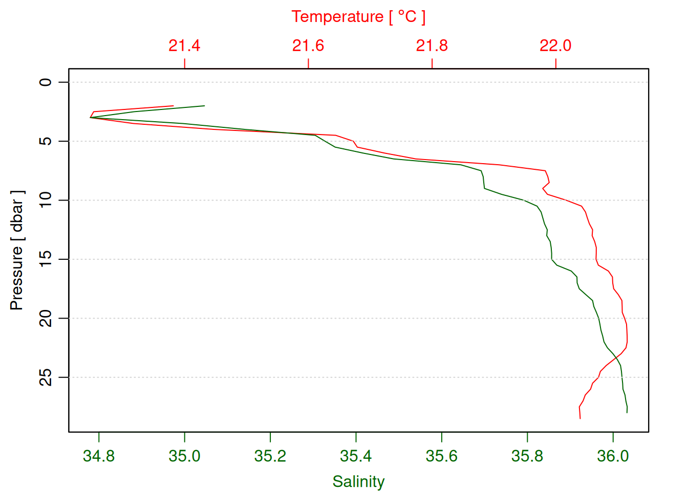 tryCatch({ oce::plotProfile(decimated_cast)# TODO: plot chl & do (prereq handle other_params in ctd_load_from_csv call above)}, error =function(e) {print("decimated cast not found")})