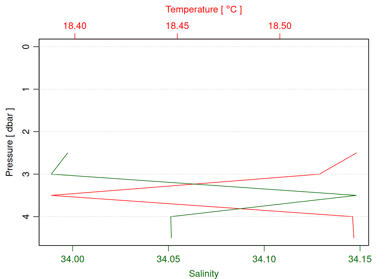 tryCatch({ oce::plotProfile(decimated_cast)# TODO: plot chl & do (prereq handle other_params in ctd_load_from_csv call above)}, error =function(e) {print("decimated cast not found")})