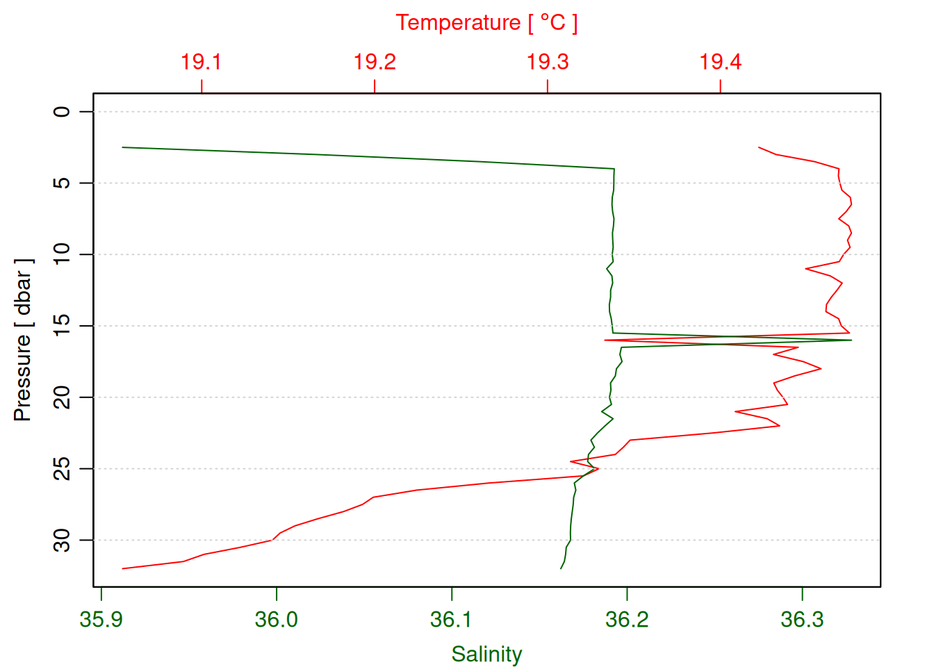 tryCatch({ oce::plotProfile(decimated_cast)# TODO: plot chl & do (prereq handle other_params in ctd_load_from_csv call above)}, error =function(e) {print("decimated cast not found")})