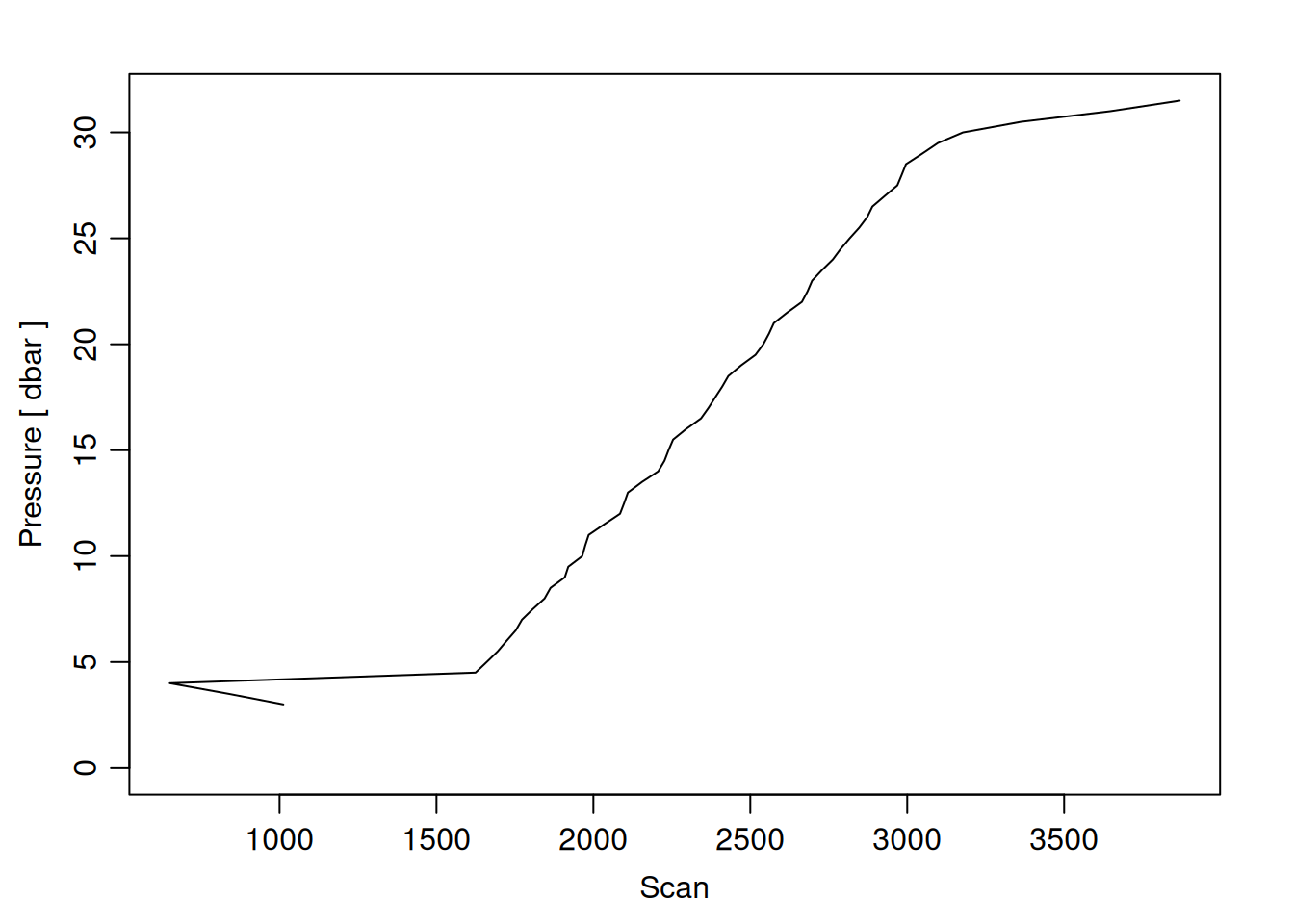 tryCatch({ trimmed_cast <-ctdTrim(cast) decimated_cast <-ctdDecimate(trimmed_cast, p =0.5)# plotting can cause the xlim failureplotScan(decimated_cast)# === export === cast_df <-as.data.frame(decimated_cast@data)# Add metadata cast_df <-mutate( cast_df,station = station_id,cruise_id = cruise_id )# drop NA rows left by cleaning cast_df <-subset(cast_df, !is.na(scan))# create folder if doesn't exist clean_data_loc <- here::here("data/02_clean")try(fs::dir_create(clean_data_loc))# save ctd to .csvwrite.csv(cast_df, glue("{clean_data_loc}/{params$cast_id}.csv"))}, error =function(e) {cat("\n=== CTD PROCESSING ERROR ===\n")cat("Cast ID:", params$cast_id, "\n")cat("Error message:\n", conditionMessage(e), "\n\n")# Safely inspect objects that might or might not exist when the error happenedif (exists("decimated_cast")) { df <-try(as.data.frame(decimated_cast@data), silent =TRUE)if (!inherits(df, "try-error")) {cat("Dataframe columns:\n")print(names(df))cat("\nSummary of key columns (scan, pressure, temperature, salinity if present):\n") known_cols <-intersect(c("scan", "pressure", "temp", "temperature", "salinity", "conductivity"), names(df))print(summary(df[known_cols], digits =3))cat("\nHead of dataframe:\n")print(head(df)) } else {cat("Could not extract dataframe from decimated_cast.\n") } } else {cat("decimated_cast was never created before the error.\n") }cat("\n=== END ERROR DEBUG INFO ===\n\n")})
