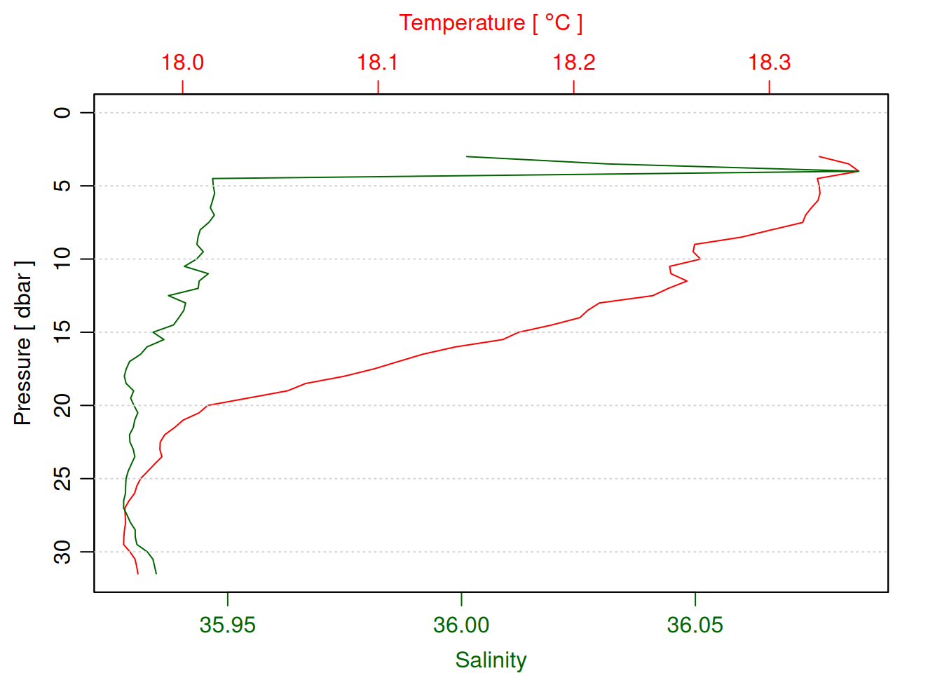 tryCatch({ oce::plotProfile(decimated_cast)# TODO: plot chl & do (prereq handle other_params in ctd_load_from_csv call above)}, error =function(e) {print("decimated cast not found")})