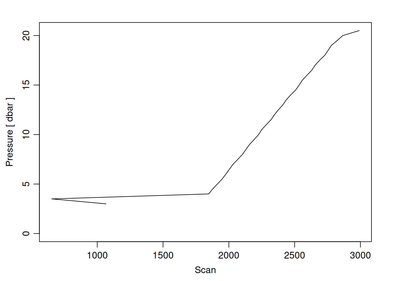tryCatch({ trimmed_cast <-ctdTrim(cast) decimated_cast <-ctdDecimate(trimmed_cast, p =0.5)# plotting can cause the xlim failureplotScan(decimated_cast)# === export === cast_df <-as.data.frame(decimated_cast@data)# Add metadata cast_df <-mutate( cast_df,station = station_id,cruise_id = cruise_id )# drop NA rows left by cleaning cast_df <-subset(cast_df, !is.na(scan))# create folder if doesn't exist clean_data_loc <- here::here("data/02_clean")try(fs::dir_create(clean_data_loc))# save ctd to .csvwrite.csv(cast_df, glue("{clean_data_loc}/{params$cast_id}.csv"))}, error =function(e) {cat("\n=== CTD PROCESSING ERROR ===\n")cat("Cast ID:", params$cast_id, "\n")cat("Error message:\n", conditionMessage(e), "\n\n")# Safely inspect objects that might or might not exist when the error happenedif (exists("decimated_cast")) { df <-try(as.data.frame(decimated_cast@data), silent =TRUE)if (!inherits(df, "try-error")) {cat("Dataframe columns:\n")print(names(df))cat("\nSummary of key columns (scan, pressure, temperature, salinity if present):\n") known_cols <-intersect(c("scan", "pressure", "temp", "temperature", "salinity", "conductivity"), names(df))print(summary(df[known_cols], digits =3))cat("\nHead of dataframe:\n")print(head(df)) } else {cat("Could not extract dataframe from decimated_cast.\n") } } else {cat("decimated_cast was never created before the error.\n") }cat("\n=== END ERROR DEBUG INFO ===\n\n")})