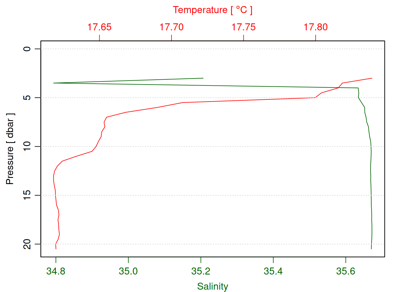 tryCatch({ oce::plotProfile(decimated_cast)# TODO: plot chl & do (prereq handle other_params in ctd_load_from_csv call above)}, error =function(e) {print("decimated cast not found")})
