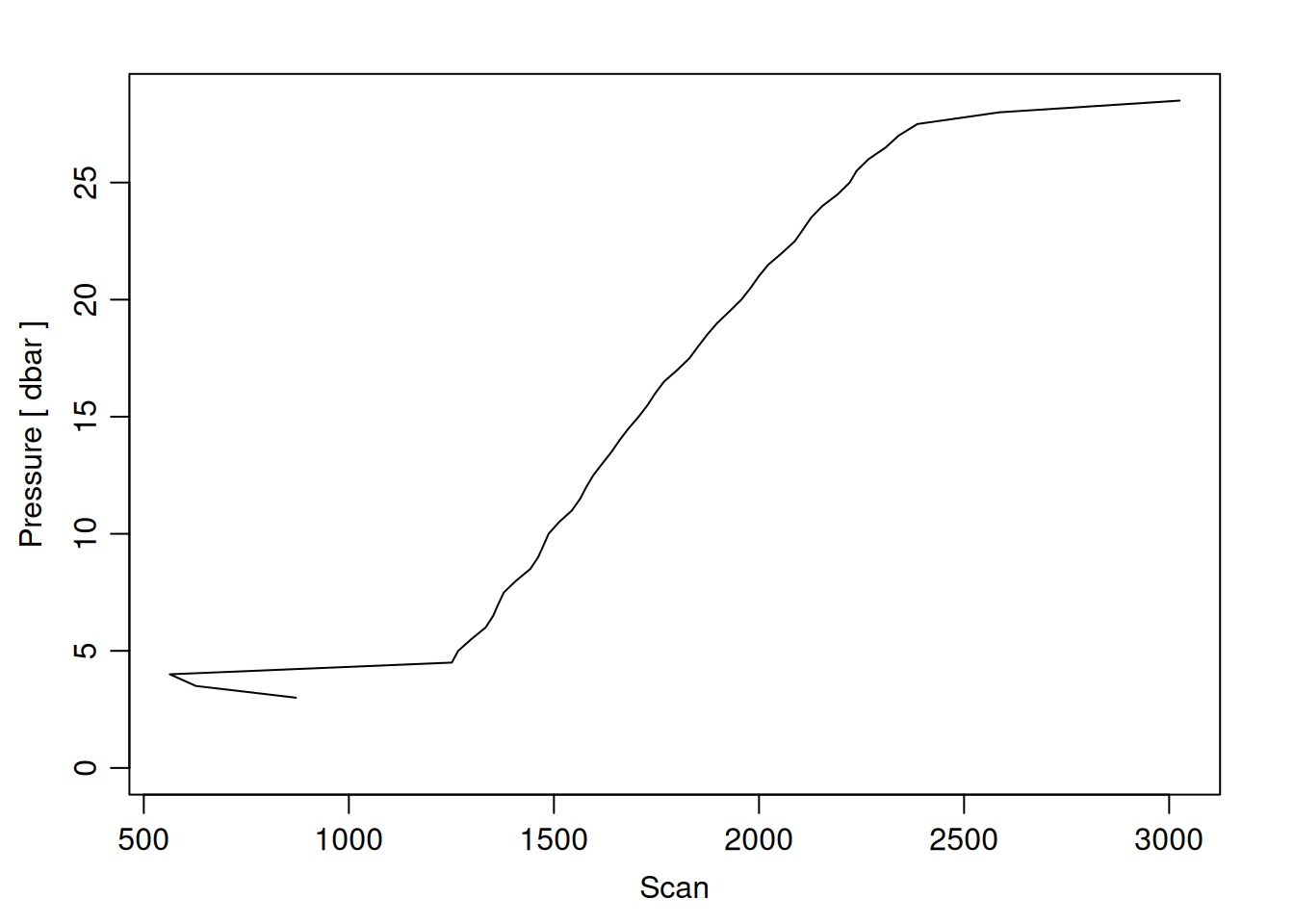 tryCatch({ trimmed_cast <-ctdTrim(cast) decimated_cast <-ctdDecimate(trimmed_cast, p =0.5)# plotting can cause the xlim failureplotScan(decimated_cast)# === export === cast_df <-as.data.frame(decimated_cast@data)# Add metadata cast_df <-mutate( cast_df,station = station_id,cruise_id = cruise_id )# drop NA rows left by cleaning cast_df <-subset(cast_df, !is.na(scan))# create folder if doesn't exist clean_data_loc <- here::here("data/02_clean")try(fs::dir_create(clean_data_loc))# save ctd to .csvwrite.csv(cast_df, glue("{clean_data_loc}/{params$cast_id}.csv"))}, error =function(e) {cat("\n=== CTD PROCESSING ERROR ===\n")cat("Cast ID:", params$cast_id, "\n")cat("Error message:\n", conditionMessage(e), "\n\n")# Safely inspect objects that might or might not exist when the error happenedif (exists("decimated_cast")) { df <-try(as.data.frame(decimated_cast@data), silent =TRUE)if (!inherits(df, "try-error")) {cat("Dataframe columns:\n")print(names(df))cat("\nSummary of key columns (scan, pressure, temperature, salinity if present):\n") known_cols <-intersect(c("scan", "pressure", "temp", "temperature", "salinity", "conductivity"), names(df))print(summary(df[known_cols], digits =3))cat("\nHead of dataframe:\n")print(head(df)) } else {cat("Could not extract dataframe from decimated_cast.\n") } } else {cat("decimated_cast was never created before the error.\n") }cat("\n=== END ERROR DEBUG INFO ===\n\n")})