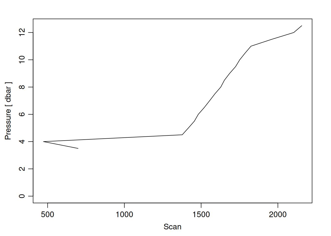 tryCatch({ trimmed_cast <-ctdTrim(cast) decimated_cast <-ctdDecimate(trimmed_cast, p =0.5)# plotting can cause the xlim failureplotScan(decimated_cast)# === export === cast_df <-as.data.frame(decimated_cast@data)# Add metadata cast_df <-mutate( cast_df,station = station_id,cruise_id = cruise_id )# drop NA rows left by cleaning cast_df <-subset(cast_df, !is.na(scan))# create folder if doesn't exist clean_data_loc <- here::here("data/02_clean")try(fs::dir_create(clean_data_loc))# save ctd to .csvwrite.csv(cast_df, glue("{clean_data_loc}/{params$cast_id}.csv"))}, error =function(e) {cat("\n=== CTD PROCESSING ERROR ===\n")cat("Cast ID:", params$cast_id, "\n")cat("Error message:\n", conditionMessage(e), "\n\n")# Safely inspect objects that might or might not exist when the error happenedif (exists("decimated_cast")) { df <-try(as.data.frame(decimated_cast@data), silent =TRUE)if (!inherits(df, "try-error")) {cat("Dataframe columns:\n")print(names(df))cat("\nSummary of key columns (scan, pressure, temperature, salinity if present):\n") known_cols <-intersect(c("scan", "pressure", "temp", "temperature", "salinity", "conductivity"), names(df))print(summary(df[known_cols], digits =3))cat("\nHead of dataframe:\n")print(head(df)) } else {cat("Could not extract dataframe from decimated_cast.\n") } } else {cat("decimated_cast was never created before the error.\n") }cat("\n=== END ERROR DEBUG INFO ===\n\n")})