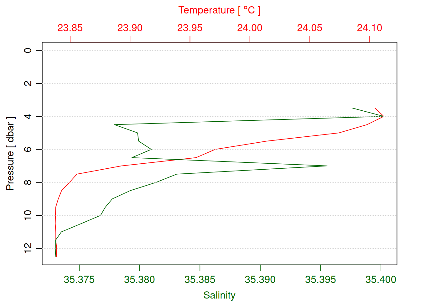 tryCatch({ oce::plotProfile(decimated_cast)# TODO: plot chl & do (prereq handle other_params in ctd_load_from_csv call above)}, error =function(e) {print("decimated cast not found")})