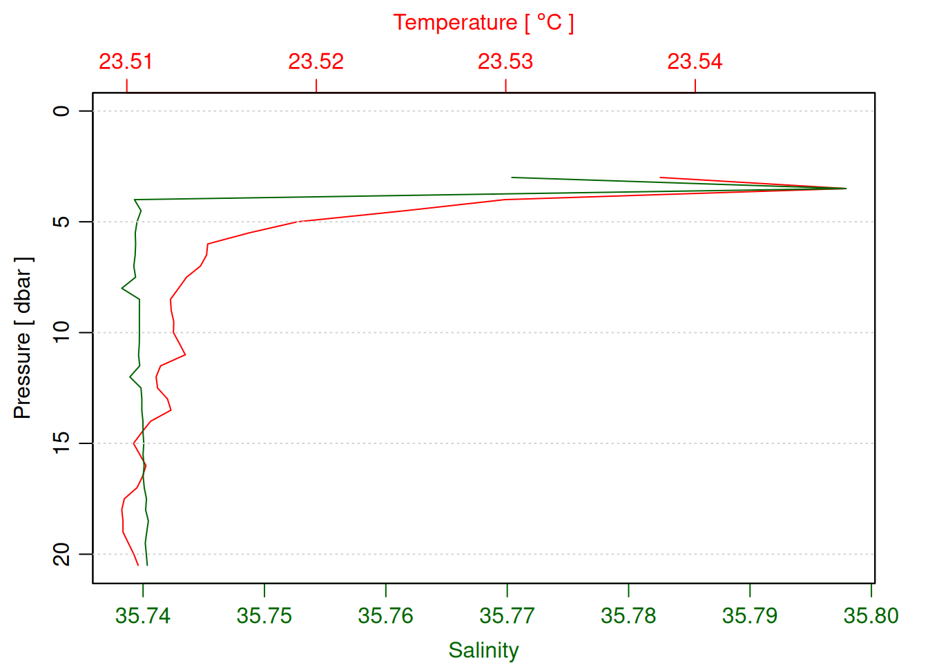tryCatch({ oce::plotProfile(decimated_cast)# TODO: plot chl & do (prereq handle other_params in ctd_load_from_csv call above)}, error =function(e) {print("decimated cast not found")})