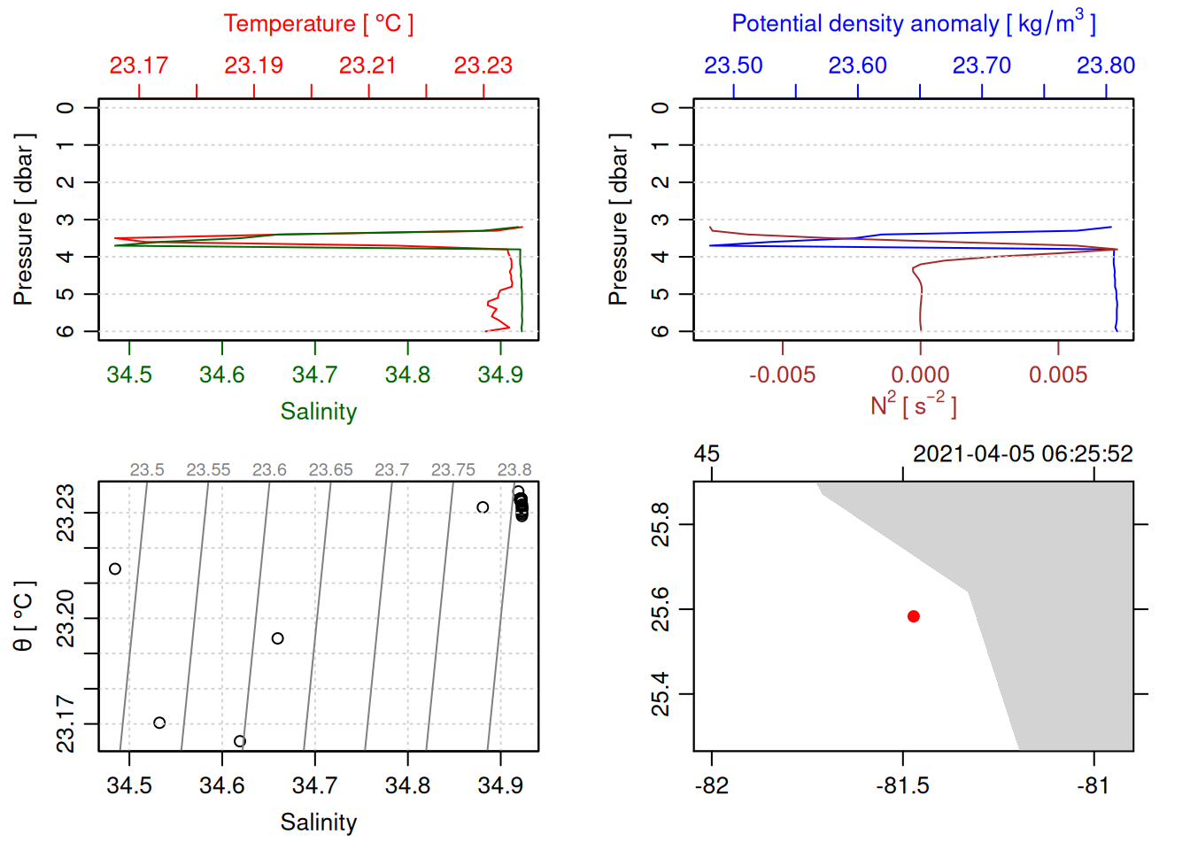 tryCatch({ trimmed_cast <-ctdTrim(cast) decimated_cast <-ctdDecimate(trimmed_cast, p =0.1)# plotting can cause the xlim failureplot(decimated_cast)# === export ===# Get the scan numbers that remain after cleaning cleaned_scans <- decimated_cast@data$scan# Load original raw data to keep all columns ctd_raw <- readr::read_csv(dataFile, show_col_types =FALSE)# Filter raw data to only include the cleaned scans cast_df <- ctd_raw %>%filter(!is.na(sea_water_pressure)) %>%# Remove rows without pressure datamutate(row_num =row_number()) %>%filter(row_num %in% cleaned_scans) %>%select(-row_num)# Add metadata cast_df <-mutate( cast_df,station = station_id,cruise_id = cruise_id )# Check if there are any rows in the cleaned dataif (nrow(cast_df) ==0) {cat("\n=== WARNING: NO DATA AFTER CLEANING ===\n")cat("Cast ID:", params$cast_id, "\n")cat("Station:", station_id, "\n")cat("Cruise:", cruise_id, "\n\n")cat("Raw data rows (with pressure):", sum(!is.na(ctd_raw$sea_water_pressure)), "\n")cat("Cleaned scans to keep:", length(cleaned_scans), "\n")cat("Resulting rows:", nrow(cast_df), "\n\n")cat("Raw data summary:\n")print(summary(ctd_raw[c("sea_water_pressure", "sea_water_temperature", "sea_water_salinity")]))cat("\nCleaned scans (first 20):\n")print(head(cleaned_scans, 20))cat("\n=== CSV FILE NOT CREATED (no data) ===\n\n") } else {# create folder if doesn't exist clean_data_loc <- here::here("data/02_clean")try(fs::dir_create(clean_data_loc))# save ctd to .csv (without row names/indices)write.csv(cast_df, glue("{clean_data_loc}/{params$cast_id}.csv"), row.names =FALSE)cat("Successfully saved", nrow(cast_df), "rows to", glue("{params$cast_id}.csv"), "\n") }}, error =function(e) {cat("\n=== CTD PROCESSING ERROR ===\n")cat("Cast ID:", params$cast_id, "\n")cat("Error message:\n", conditionMessage(e), "\n\n")# Safely inspect objects that might or might not exist when the error happenedif (exists("decimated_cast")) { df <-try(as.data.frame(decimated_cast@data), silent =TRUE)if (!inherits(df, "try-error")) {cat("Dataframe columns:\n")print(names(df))cat("\nSummary of key columns (scan, pressure, temperature, salinity if present):\n") known_cols <-intersect(c("scan", "pressure", "temp", "temperature", "salinity", "conductivity"), names(df))print(summary(df[known_cols], digits =3))cat("\nHead of dataframe:\n")print(head(df)) } else {cat("Could not extract dataframe from decimated_cast.\n") } } else {cat("decimated_cast was never created before the error.\n") }cat("\n=== END ERROR DEBUG INFO ===\n\n")})