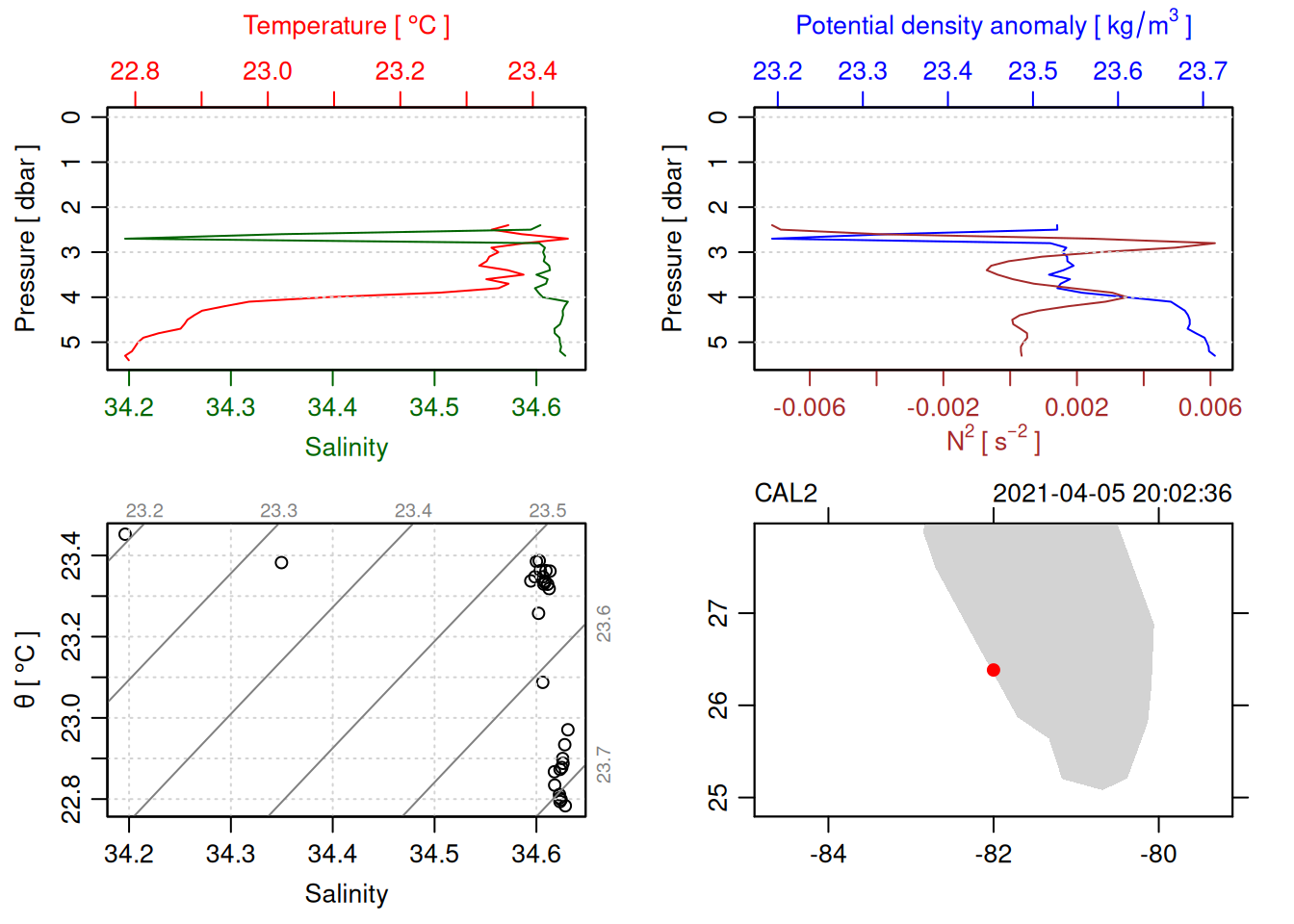 tryCatch({ trimmed_cast <-ctdTrim(cast) decimated_cast <-ctdDecimate(trimmed_cast, p =0.1)# plotting can cause the xlim failureplot(decimated_cast)# === export ===# Get the scan numbers that remain after cleaning cleaned_scans <- decimated_cast@data$scan# Load original raw data to keep all columns ctd_raw <- readr::read_csv(dataFile, show_col_types =FALSE)# Filter raw data to only include the cleaned scans cast_df <- ctd_raw %>%filter(!is.na(sea_water_pressure)) %>%# Remove rows without pressure datamutate(row_num =row_number()) %>%filter(row_num %in% cleaned_scans) %>%select(-row_num)# Add metadata cast_df <-mutate( cast_df,station = station_id,cruise_id = cruise_id )# Check if there are any rows in the cleaned dataif (nrow(cast_df) ==0) {cat("\n=== WARNING: NO DATA AFTER CLEANING ===\n")cat("Cast ID:", params$cast_id, "\n")cat("Station:", station_id, "\n")cat("Cruise:", cruise_id, "\n\n")cat("Raw data rows (with pressure):", sum(!is.na(ctd_raw$sea_water_pressure)), "\n")cat("Cleaned scans to keep:", length(cleaned_scans), "\n")cat("Resulting rows:", nrow(cast_df), "\n\n")cat("Raw data summary:\n")print(summary(ctd_raw[c("sea_water_pressure", "sea_water_temperature", "sea_water_salinity")]))cat("\nCleaned scans (first 20):\n")print(head(cleaned_scans, 20))cat("\n=== CSV FILE NOT CREATED (no data) ===\n\n") } else {# create folder if doesn't exist clean_data_loc <- here::here("data/02_clean")try(fs::dir_create(clean_data_loc))# save ctd to .csv (without row names/indices)write.csv(cast_df, glue("{clean_data_loc}/{params$cast_id}.csv"), row.names =FALSE)cat("Successfully saved", nrow(cast_df), "rows to", glue("{params$cast_id}.csv"), "\n") }}, error =function(e) {cat("\n=== CTD PROCESSING ERROR ===\n")cat("Cast ID:", params$cast_id, "\n")cat("Error message:\n", conditionMessage(e), "\n\n")# Safely inspect objects that might or might not exist when the error happenedif (exists("decimated_cast")) { df <-try(as.data.frame(decimated_cast@data), silent =TRUE)if (!inherits(df, "try-error")) {cat("Dataframe columns:\n")print(names(df))cat("\nSummary of key columns (scan, pressure, temperature, salinity if present):\n") known_cols <-intersect(c("scan", "pressure", "temp", "temperature", "salinity", "conductivity"), names(df))print(summary(df[known_cols], digits =3))cat("\nHead of dataframe:\n")print(head(df)) } else {cat("Could not extract dataframe from decimated_cast.\n") } } else {cat("decimated_cast was never created before the error.\n") }cat("\n=== END ERROR DEBUG INFO ===\n\n")})