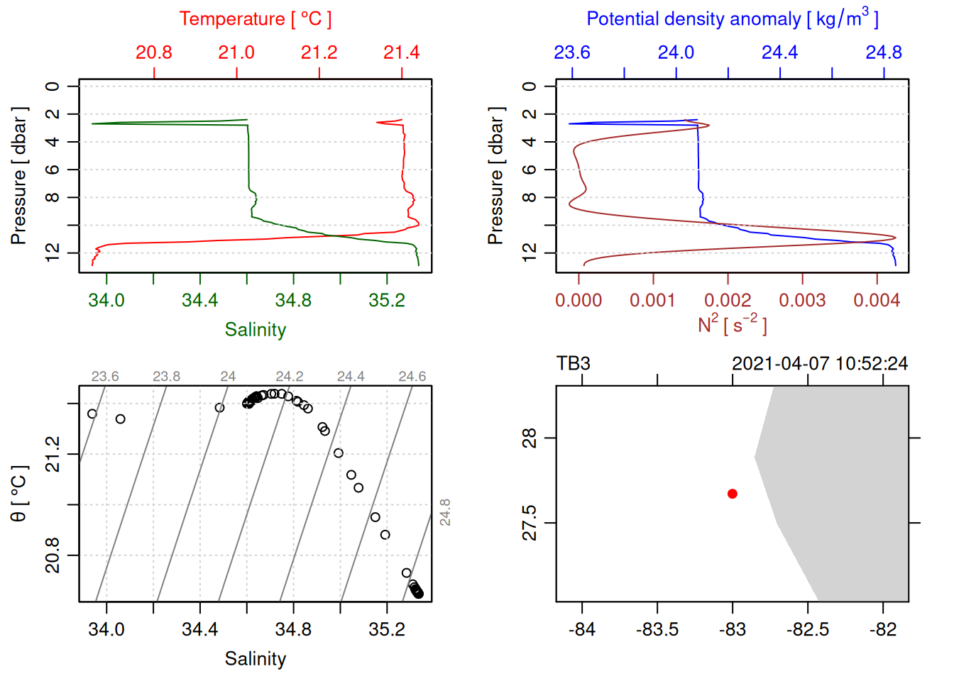 tryCatch({ trimmed_cast <-ctdTrim(cast) decimated_cast <-ctdDecimate(trimmed_cast, p =0.1)# plotting can cause the xlim failureplot(decimated_cast)# === export ===# Get the scan numbers that remain after cleaning cleaned_scans <- decimated_cast@data$scan# Load original raw data to keep all columns ctd_raw <- readr::read_csv(dataFile, show_col_types =FALSE)# Filter raw data to only include the cleaned scans cast_df <- ctd_raw %>%filter(!is.na(sea_water_pressure)) %>%# Remove rows without pressure datamutate(row_num =row_number()) %>%filter(row_num %in% cleaned_scans) %>%select(-row_num)# Add metadata cast_df <-mutate( cast_df,station = station_id,cruise_id = cruise_id )# Check if there are any rows in the cleaned dataif (nrow(cast_df) ==0) {cat("\n=== WARNING: NO DATA AFTER CLEANING ===\n")cat("Cast ID:", params$cast_id, "\n")cat("Station:", station_id, "\n")cat("Cruise:", cruise_id, "\n\n")cat("Raw data rows (with pressure):", sum(!is.na(ctd_raw$sea_water_pressure)), "\n")cat("Cleaned scans to keep:", length(cleaned_scans), "\n")cat("Resulting rows:", nrow(cast_df), "\n\n")cat("Raw data summary:\n")print(summary(ctd_raw[c("sea_water_pressure", "sea_water_temperature", "sea_water_salinity")]))cat("\nCleaned scans (first 20):\n")print(head(cleaned_scans, 20))cat("\n=== CSV FILE NOT CREATED (no data) ===\n\n") } else {# create folder if doesn't exist clean_data_loc <- here::here("data/02_clean")try(fs::dir_create(clean_data_loc))# save ctd to .csv (without row names/indices)write.csv(cast_df, glue("{clean_data_loc}/{params$cast_id}.csv"), row.names =FALSE)cat("Successfully saved", nrow(cast_df), "rows to", glue("{params$cast_id}.csv"), "\n") }}, error =function(e) {cat("\n=== CTD PROCESSING ERROR ===\n")cat("Cast ID:", params$cast_id, "\n")cat("Error message:\n", conditionMessage(e), "\n\n")# Safely inspect objects that might or might not exist when the error happenedif (exists("decimated_cast")) { df <-try(as.data.frame(decimated_cast@data), silent =TRUE)if (!inherits(df, "try-error")) {cat("Dataframe columns:\n")print(names(df))cat("\nSummary of key columns (scan, pressure, temperature, salinity if present):\n") known_cols <-intersect(c("scan", "pressure", "temp", "temperature", "salinity", "conductivity"), names(df))print(summary(df[known_cols], digits =3))cat("\nHead of dataframe:\n")print(head(df)) } else {cat("Could not extract dataframe from decimated_cast.\n") } } else {cat("decimated_cast was never created before the error.\n") }cat("\n=== END ERROR DEBUG INFO ===\n\n")})