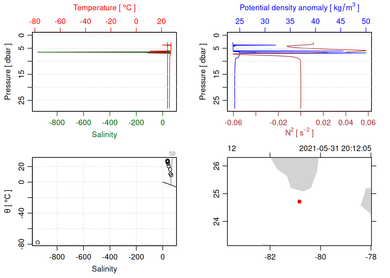 # TODO: Include param here that specifies to handle QC flags. This should be done before converting to a OCE object. QC flag columns are listed in [this spreadsheet](https://docs.google.com/spreadsheets/d/1uCxEmJRqErU-HCQiRQ1FpyiIqtNaGgMSBI0WvrtwBRU/edit?gid=137286311#gid=137286311) and are not supposed to be included in the oce object. QC param values are : # 1 good# 2 +/- 3*std_dev# 4 +/- 5*std_dev# 9 missing# Data column should be set to NA if corresponding QC column has value greater than threshold (recommended threshold is 5*std_dev).# Will need to loop through *_qc columns.# TODO: drop spikes (how? low-pass?).# TODO: combine replicate sensors (eg temp1 temp2).
