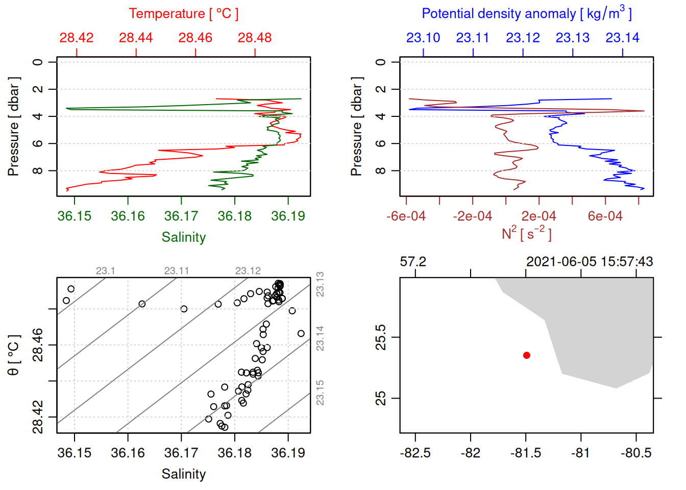 tryCatch({ trimmed_cast <-ctdTrim(cast) decimated_cast <-ctdDecimate(trimmed_cast, p =0.1)# plotting can cause the xlim failureplot(decimated_cast)# === export ===# Get the scan numbers that remain after cleaning cleaned_scans <- decimated_cast@data$scan# Load original raw data to keep all columns ctd_raw <- readr::read_csv(dataFile, show_col_types =FALSE)# Filter raw data to only include the cleaned scans cast_df <- ctd_raw %>%filter(!is.na(sea_water_pressure)) %>%# Remove rows without pressure datamutate(row_num =row_number()) %>%filter(row_num %in% cleaned_scans) %>%select(-row_num)# Add metadata cast_df <-mutate( cast_df,station = station_id,cruise_id = cruise_id )# Check if there are any rows in the cleaned dataif (nrow(cast_df) ==0) {cat("\n=== WARNING: NO DATA AFTER CLEANING ===\n")cat("Cast ID:", params$cast_id, "\n")cat("Station:", station_id, "\n")cat("Cruise:", cruise_id, "\n\n")cat("Raw data rows (with pressure):", sum(!is.na(ctd_raw$sea_water_pressure)), "\n")cat("Cleaned scans to keep:", length(cleaned_scans), "\n")cat("Resulting rows:", nrow(cast_df), "\n\n")cat("Raw data summary:\n")print(summary(ctd_raw[c("sea_water_pressure", "sea_water_temperature", "sea_water_salinity")]))cat("\nCleaned scans (first 20):\n")print(head(cleaned_scans, 20))cat("\n=== CSV FILE NOT CREATED (no data) ===\n\n") } else {# create folder if doesn't exist clean_data_loc <- here::here("data/02_clean")try(fs::dir_create(clean_data_loc))# save ctd to .csv (without row names/indices)write.csv(cast_df, glue("{clean_data_loc}/{params$cast_id}.csv"), row.names =FALSE)cat("Successfully saved", nrow(cast_df), "rows to", glue("{params$cast_id}.csv"), "\n") }}, error =function(e) {cat("\n=== CTD PROCESSING ERROR ===\n")cat("Cast ID:", params$cast_id, "\n")cat("Error message:\n", conditionMessage(e), "\n\n")# Safely inspect objects that might or might not exist when the error happenedif (exists("decimated_cast")) { df <-try(as.data.frame(decimated_cast@data), silent =TRUE)if (!inherits(df, "try-error")) {cat("Dataframe columns:\n")print(names(df))cat("\nSummary of key columns (scan, pressure, temperature, salinity if present):\n") known_cols <-intersect(c("scan", "pressure", "temp", "temperature", "salinity", "conductivity"), names(df))print(summary(df[known_cols], digits =3))cat("\nHead of dataframe:\n")print(head(df)) } else {cat("Could not extract dataframe from decimated_cast.\n") } } else {cat("decimated_cast was never created before the error.\n") }cat("\n=== END ERROR DEBUG INFO ===\n\n")})