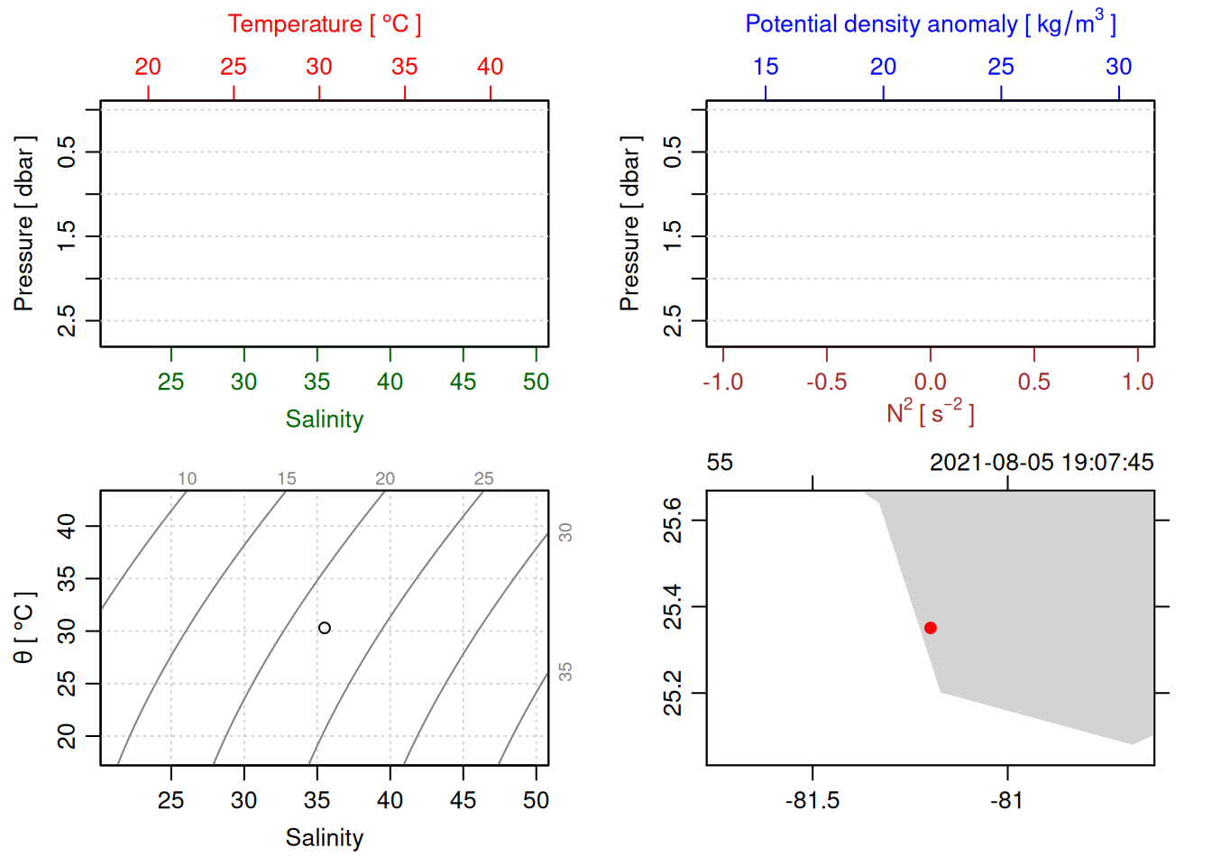 tryCatch({ trimmed_cast <-ctdTrim(cast) decimated_cast <-ctdDecimate(trimmed_cast, p =0.1)# plotting can cause the xlim failureplot(decimated_cast)# === export ===# Get the scan numbers that remain after cleaning cleaned_scans <- decimated_cast@data$scan# Load original raw data to keep all columns ctd_raw <- readr::read_csv(dataFile, show_col_types =FALSE)# Filter raw data to only include the cleaned scans cast_df <- ctd_raw %>%filter(!is.na(sea_water_pressure)) %>%# Remove rows without pressure datamutate(row_num =row_number()) %>%filter(row_num %in% cleaned_scans) %>%select(-row_num)# Add metadata cast_df <-mutate( cast_df,station = station_id,cruise_id = cruise_id )# Check if there are any rows in the cleaned dataif (nrow(cast_df) ==0) {cat("\n=== WARNING: NO DATA AFTER CLEANING ===\n")cat("Cast ID:", params$cast_id, "\n")cat("Station:", station_id, "\n")cat("Cruise:", cruise_id, "\n\n")cat("Raw data rows (with pressure):", sum(!is.na(ctd_raw$sea_water_pressure)), "\n")cat("Cleaned scans to keep:", length(cleaned_scans), "\n")cat("Resulting rows:", nrow(cast_df), "\n\n")cat("Raw data summary:\n")print(summary(ctd_raw[c("sea_water_pressure", "sea_water_temperature", "sea_water_salinity")]))cat("\nCleaned scans (first 20):\n")print(head(cleaned_scans, 20))cat("\n=== CSV FILE NOT CREATED (no data) ===\n\n") } else {# create folder if doesn't exist clean_data_loc <- here::here("data/02_clean")try(fs::dir_create(clean_data_loc))# save ctd to .csv (without row names/indices)write.csv(cast_df, glue("{clean_data_loc}/{params$cast_id}.csv"), row.names =FALSE)cat("Successfully saved", nrow(cast_df), "rows to", glue("{params$cast_id}.csv"), "\n") }}, error =function(e) {cat("\n=== CTD PROCESSING ERROR ===\n")cat("Cast ID:", params$cast_id, "\n")cat("Error message:\n", conditionMessage(e), "\n\n")# Safely inspect objects that might or might not exist when the error happenedif (exists("decimated_cast")) { df <-try(as.data.frame(decimated_cast@data), silent =TRUE)if (!inherits(df, "try-error")) {cat("Dataframe columns:\n")print(names(df))cat("\nSummary of key columns (scan, pressure, temperature, salinity if present):\n") known_cols <-intersect(c("scan", "pressure", "temp", "temperature", "salinity", "conductivity"), names(df))print(summary(df[known_cols], digits =3))cat("\nHead of dataframe:\n")print(head(df)) } else {cat("Could not extract dataframe from decimated_cast.\n") } } else {cat("decimated_cast was never created before the error.\n") }cat("\n=== END ERROR DEBUG INFO ===\n\n")})