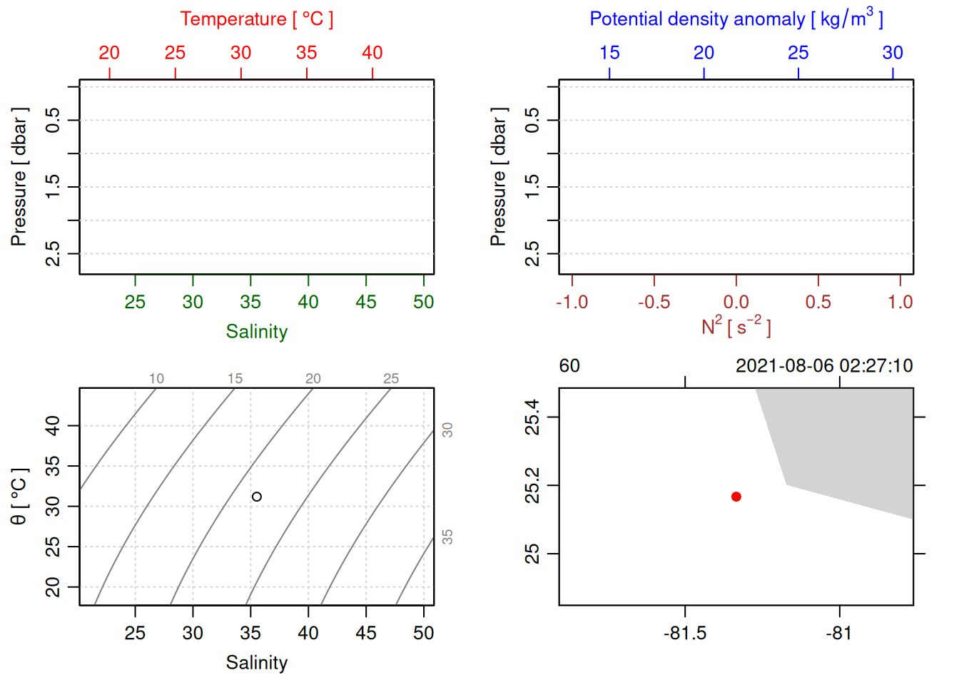 tryCatch({ trimmed_cast <-ctdTrim(cast) decimated_cast <-ctdDecimate(trimmed_cast, p =0.1)# plotting can cause the xlim failureplot(decimated_cast)# === export ===# Get the scan numbers that remain after cleaning cleaned_scans <- decimated_cast@data$scan# Load original raw data to keep all columns ctd_raw <- readr::read_csv(dataFile, show_col_types =FALSE)# Filter raw data to only include the cleaned scans cast_df <- ctd_raw %>%filter(!is.na(sea_water_pressure)) %>%# Remove rows without pressure datamutate(row_num =row_number()) %>%filter(row_num %in% cleaned_scans) %>%select(-row_num)# Add metadata cast_df <-mutate( cast_df,station = station_id,cruise_id = cruise_id )# Check if there are any rows in the cleaned dataif (nrow(cast_df) ==0) {cat("\n=== WARNING: NO DATA AFTER CLEANING ===\n")cat("Cast ID:", params$cast_id, "\n")cat("Station:", station_id, "\n")cat("Cruise:", cruise_id, "\n\n")cat("Raw data rows (with pressure):", sum(!is.na(ctd_raw$sea_water_pressure)), "\n")cat("Cleaned scans to keep:", length(cleaned_scans), "\n")cat("Resulting rows:", nrow(cast_df), "\n\n")cat("Raw data summary:\n")print(summary(ctd_raw[c("sea_water_pressure", "sea_water_temperature", "sea_water_salinity")]))cat("\nCleaned scans (first 20):\n")print(head(cleaned_scans, 20))cat("\n=== CSV FILE NOT CREATED (no data) ===\n\n") } else {# create folder if doesn't exist clean_data_loc <- here::here("data/02_clean")try(fs::dir_create(clean_data_loc))# save ctd to .csv (without row names/indices)write.csv(cast_df, glue("{clean_data_loc}/{params$cast_id}.csv"), row.names =FALSE)cat("Successfully saved", nrow(cast_df), "rows to", glue("{params$cast_id}.csv"), "\n") }}, error =function(e) {cat("\n=== CTD PROCESSING ERROR ===\n")cat("Cast ID:", params$cast_id, "\n")cat("Error message:\n", conditionMessage(e), "\n\n")# Safely inspect objects that might or might not exist when the error happenedif (exists("decimated_cast")) { df <-try(as.data.frame(decimated_cast@data), silent =TRUE)if (!inherits(df, "try-error")) {cat("Dataframe columns:\n")print(names(df))cat("\nSummary of key columns (scan, pressure, temperature, salinity if present):\n") known_cols <-intersect(c("scan", "pressure", "temp", "temperature", "salinity", "conductivity"), names(df))print(summary(df[known_cols], digits =3))cat("\nHead of dataframe:\n")print(head(df)) } else {cat("Could not extract dataframe from decimated_cast.\n") } } else {cat("decimated_cast was never created before the error.\n") }cat("\n=== END ERROR DEBUG INFO ===\n\n")})