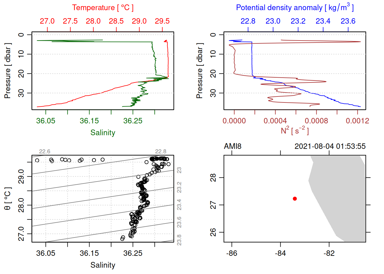 tryCatch({ trimmed_cast <-ctdTrim(cast) decimated_cast <-ctdDecimate(trimmed_cast, p =0.1)# plotting can cause the xlim failureplot(decimated_cast)# === export ===# Get the scan numbers that remain after cleaning cleaned_scans <- decimated_cast@data$scan# Load original raw data to keep all columns ctd_raw <- readr::read_csv(dataFile, show_col_types =FALSE)# Filter raw data to only include the cleaned scans cast_df <- ctd_raw %>%filter(!is.na(sea_water_pressure)) %>%# Remove rows without pressure datamutate(row_num =row_number()) %>%filter(row_num %in% cleaned_scans) %>%select(-row_num)# Add metadata cast_df <-mutate( cast_df,station = station_id,cruise_id = cruise_id )# Check if there are any rows in the cleaned dataif (nrow(cast_df) ==0) {cat("\n=== WARNING: NO DATA AFTER CLEANING ===\n")cat("Cast ID:", params$cast_id, "\n")cat("Station:", station_id, "\n")cat("Cruise:", cruise_id, "\n\n")cat("Raw data rows (with pressure):", sum(!is.na(ctd_raw$sea_water_pressure)), "\n")cat("Cleaned scans to keep:", length(cleaned_scans), "\n")cat("Resulting rows:", nrow(cast_df), "\n\n")cat("Raw data summary:\n")print(summary(ctd_raw[c("sea_water_pressure", "sea_water_temperature", "sea_water_salinity")]))cat("\nCleaned scans (first 20):\n")print(head(cleaned_scans, 20))cat("\n=== CSV FILE NOT CREATED (no data) ===\n\n") } else {# create folder if doesn't exist clean_data_loc <- here::here("data/02_clean")try(fs::dir_create(clean_data_loc))# save ctd to .csv (without row names/indices)write.csv(cast_df, glue("{clean_data_loc}/{params$cast_id}.csv"), row.names =FALSE)cat("Successfully saved", nrow(cast_df), "rows to", glue("{params$cast_id}.csv"), "\n") }}, error =function(e) {cat("\n=== CTD PROCESSING ERROR ===\n")cat("Cast ID:", params$cast_id, "\n")cat("Error message:\n", conditionMessage(e), "\n\n")# Safely inspect objects that might or might not exist when the error happenedif (exists("decimated_cast")) { df <-try(as.data.frame(decimated_cast@data), silent =TRUE)if (!inherits(df, "try-error")) {cat("Dataframe columns:\n")print(names(df))cat("\nSummary of key columns (scan, pressure, temperature, salinity if present):\n") known_cols <-intersect(c("scan", "pressure", "temp", "temperature", "salinity", "conductivity"), names(df))print(summary(df[known_cols], digits =3))cat("\nHead of dataframe:\n")print(head(df)) } else {cat("Could not extract dataframe from decimated_cast.\n") } } else {cat("decimated_cast was never created before the error.\n") }cat("\n=== END ERROR DEBUG INFO ===\n\n")})