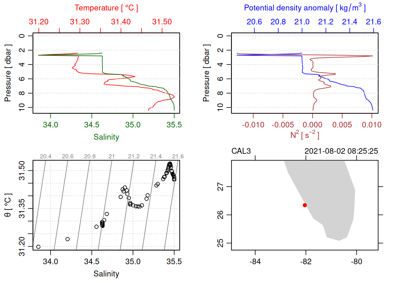 tryCatch({ trimmed_cast <-ctdTrim(cast) decimated_cast <-ctdDecimate(trimmed_cast, p =0.1)# plotting can cause the xlim failureplot(decimated_cast)# === export ===# Get the scan numbers that remain after cleaning cleaned_scans <- decimated_cast@data$scan# Load original raw data to keep all columns ctd_raw <- readr::read_csv(dataFile, show_col_types =FALSE)# Filter raw data to only include the cleaned scans cast_df <- ctd_raw %>%filter(!is.na(sea_water_pressure)) %>%# Remove rows without pressure datamutate(row_num =row_number()) %>%filter(row_num %in% cleaned_scans) %>%select(-row_num)# Add metadata cast_df <-mutate( cast_df,station = station_id,cruise_id = cruise_id )# Check if there are any rows in the cleaned dataif (nrow(cast_df) ==0) {cat("\n=== WARNING: NO DATA AFTER CLEANING ===\n")cat("Cast ID:", params$cast_id, "\n")cat("Station:", station_id, "\n")cat("Cruise:", cruise_id, "\n\n")cat("Raw data rows (with pressure):", sum(!is.na(ctd_raw$sea_water_pressure)), "\n")cat("Cleaned scans to keep:", length(cleaned_scans), "\n")cat("Resulting rows:", nrow(cast_df), "\n\n")cat("Raw data summary:\n")print(summary(ctd_raw[c("sea_water_pressure", "sea_water_temperature", "sea_water_salinity")]))cat("\nCleaned scans (first 20):\n")print(head(cleaned_scans, 20))cat("\n=== CSV FILE NOT CREATED (no data) ===\n\n") } else {# create folder if doesn't exist clean_data_loc <- here::here("data/02_clean")try(fs::dir_create(clean_data_loc))# save ctd to .csv (without row names/indices)write.csv(cast_df, glue("{clean_data_loc}/{params$cast_id}.csv"), row.names =FALSE)cat("Successfully saved", nrow(cast_df), "rows to", glue("{params$cast_id}.csv"), "\n") }}, error =function(e) {cat("\n=== CTD PROCESSING ERROR ===\n")cat("Cast ID:", params$cast_id, "\n")cat("Error message:\n", conditionMessage(e), "\n\n")# Safely inspect objects that might or might not exist when the error happenedif (exists("decimated_cast")) { df <-try(as.data.frame(decimated_cast@data), silent =TRUE)if (!inherits(df, "try-error")) {cat("Dataframe columns:\n")print(names(df))cat("\nSummary of key columns (scan, pressure, temperature, salinity if present):\n") known_cols <-intersect(c("scan", "pressure", "temp", "temperature", "salinity", "conductivity"), names(df))print(summary(df[known_cols], digits =3))cat("\nHead of dataframe:\n")print(head(df)) } else {cat("Could not extract dataframe from decimated_cast.\n") } } else {cat("decimated_cast was never created before the error.\n") }cat("\n=== END ERROR DEBUG INFO ===\n\n")})