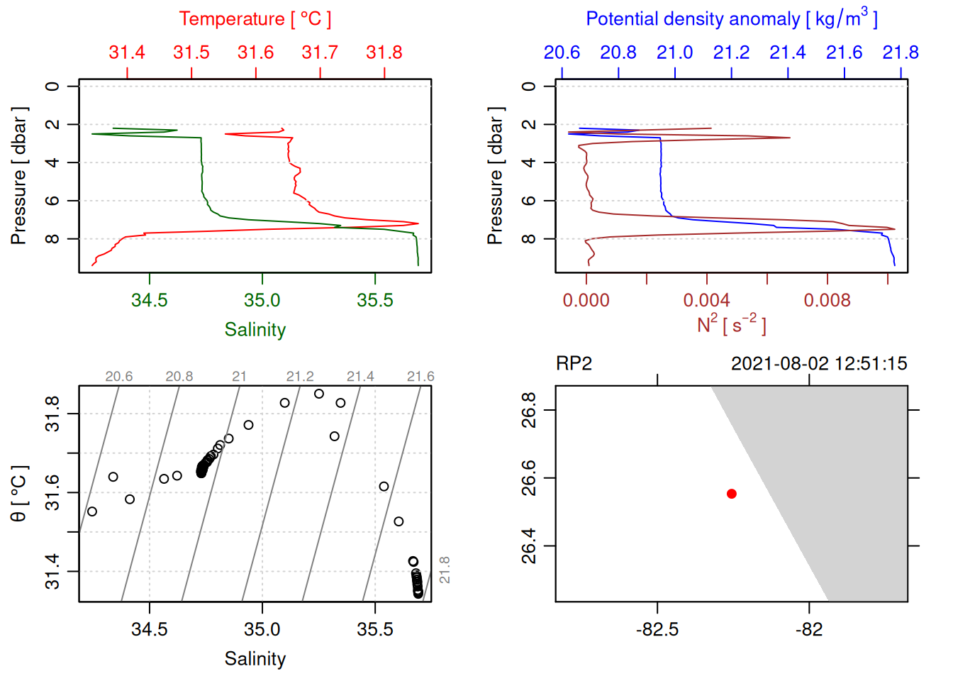 tryCatch({ trimmed_cast <-ctdTrim(cast) decimated_cast <-ctdDecimate(trimmed_cast, p =0.1)# plotting can cause the xlim failureplot(decimated_cast)# === export ===# Get the scan numbers that remain after cleaning cleaned_scans <- decimated_cast@data$scan# Load original raw data to keep all columns ctd_raw <- readr::read_csv(dataFile, show_col_types =FALSE)# Filter raw data to only include the cleaned scans cast_df <- ctd_raw %>%filter(!is.na(sea_water_pressure)) %>%# Remove rows without pressure datamutate(row_num =row_number()) %>%filter(row_num %in% cleaned_scans) %>%select(-row_num)# Add metadata cast_df <-mutate( cast_df,station = station_id,cruise_id = cruise_id )# Check if there are any rows in the cleaned dataif (nrow(cast_df) ==0) {cat("\n=== WARNING: NO DATA AFTER CLEANING ===\n")cat("Cast ID:", params$cast_id, "\n")cat("Station:", station_id, "\n")cat("Cruise:", cruise_id, "\n\n")cat("Raw data rows (with pressure):", sum(!is.na(ctd_raw$sea_water_pressure)), "\n")cat("Cleaned scans to keep:", length(cleaned_scans), "\n")cat("Resulting rows:", nrow(cast_df), "\n\n")cat("Raw data summary:\n")print(summary(ctd_raw[c("sea_water_pressure", "sea_water_temperature", "sea_water_salinity")]))cat("\nCleaned scans (first 20):\n")print(head(cleaned_scans, 20))cat("\n=== CSV FILE NOT CREATED (no data) ===\n\n") } else {# create folder if doesn't exist clean_data_loc <- here::here("data/02_clean")try(fs::dir_create(clean_data_loc))# save ctd to .csv (without row names/indices)write.csv(cast_df, glue("{clean_data_loc}/{params$cast_id}.csv"), row.names =FALSE)cat("Successfully saved", nrow(cast_df), "rows to", glue("{params$cast_id}.csv"), "\n") }}, error =function(e) {cat("\n=== CTD PROCESSING ERROR ===\n")cat("Cast ID:", params$cast_id, "\n")cat("Error message:\n", conditionMessage(e), "\n\n")# Safely inspect objects that might or might not exist when the error happenedif (exists("decimated_cast")) { df <-try(as.data.frame(decimated_cast@data), silent =TRUE)if (!inherits(df, "try-error")) {cat("Dataframe columns:\n")print(names(df))cat("\nSummary of key columns (scan, pressure, temperature, salinity if present):\n") known_cols <-intersect(c("scan", "pressure", "temp", "temperature", "salinity", "conductivity"), names(df))print(summary(df[known_cols], digits =3))cat("\nHead of dataframe:\n")print(head(df)) } else {cat("Could not extract dataframe from decimated_cast.\n") } } else {cat("decimated_cast was never created before the error.\n") }cat("\n=== END ERROR DEBUG INFO ===\n\n")})