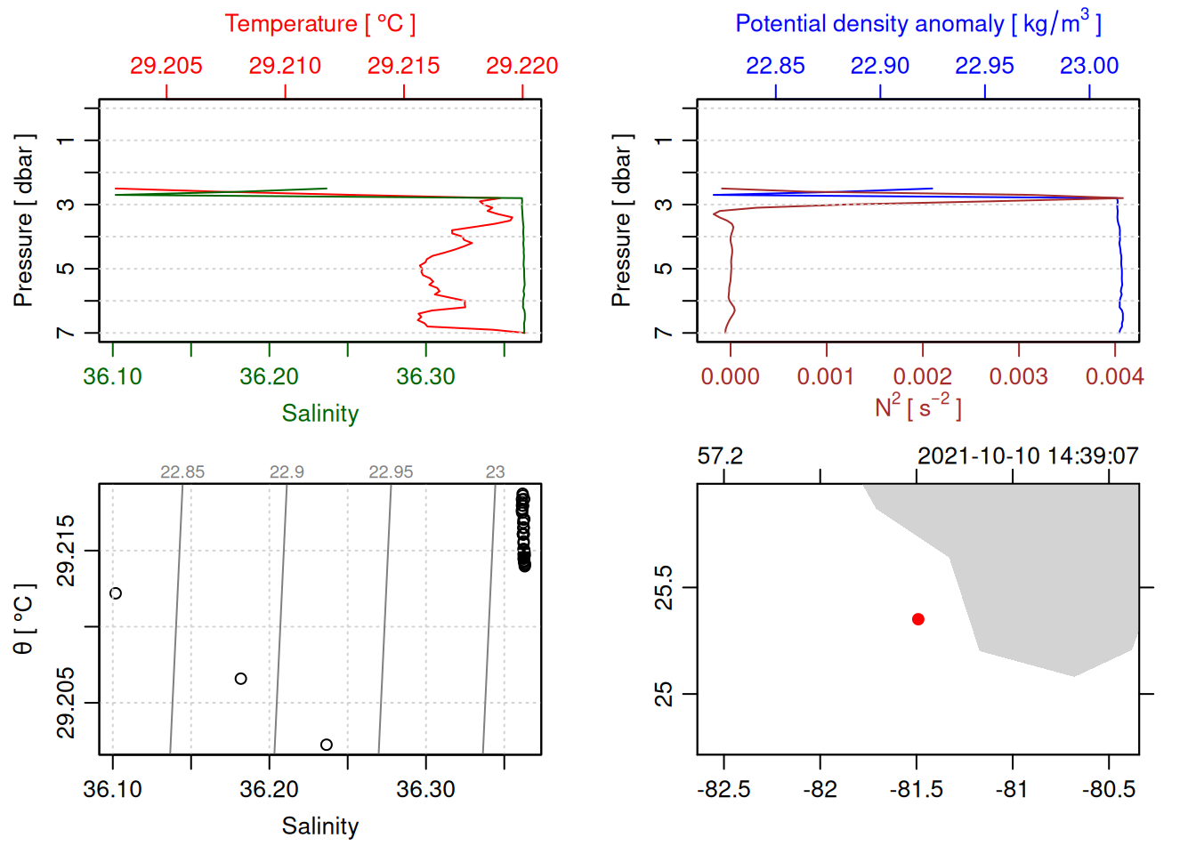 tryCatch({ trimmed_cast <-ctdTrim(cast) decimated_cast <-ctdDecimate(trimmed_cast, p =0.1)# plotting can cause the xlim failureplot(decimated_cast)# === export ===# Get the scan numbers that remain after cleaning cleaned_scans <- decimated_cast@data$scan# Load original raw data to keep all columns ctd_raw <- readr::read_csv(dataFile, show_col_types =FALSE)# Filter raw data to only include the cleaned scans cast_df <- ctd_raw %>%filter(!is.na(sea_water_pressure)) %>%# Remove rows without pressure datamutate(row_num =row_number()) %>%filter(row_num %in% cleaned_scans) %>%select(-row_num)# Add metadata cast_df <-mutate( cast_df,station = station_id,cruise_id = cruise_id )# Check if there are any rows in the cleaned dataif (nrow(cast_df) ==0) {cat("\n=== WARNING: NO DATA AFTER CLEANING ===\n")cat("Cast ID:", params$cast_id, "\n")cat("Station:", station_id, "\n")cat("Cruise:", cruise_id, "\n\n")cat("Raw data rows (with pressure):", sum(!is.na(ctd_raw$sea_water_pressure)), "\n")cat("Cleaned scans to keep:", length(cleaned_scans), "\n")cat("Resulting rows:", nrow(cast_df), "\n\n")cat("Raw data summary:\n")print(summary(ctd_raw[c("sea_water_pressure", "sea_water_temperature", "sea_water_salinity")]))cat("\nCleaned scans (first 20):\n")print(head(cleaned_scans, 20))cat("\n=== CSV FILE NOT CREATED (no data) ===\n\n") } else {# create folder if doesn't exist clean_data_loc <- here::here("data/02_clean")try(fs::dir_create(clean_data_loc))# save ctd to .csv (without row names/indices)write.csv(cast_df, glue("{clean_data_loc}/{params$cast_id}.csv"), row.names =FALSE)cat("Successfully saved", nrow(cast_df), "rows to", glue("{params$cast_id}.csv"), "\n") }}, error =function(e) {cat("\n=== CTD PROCESSING ERROR ===\n")cat("Cast ID:", params$cast_id, "\n")cat("Error message:\n", conditionMessage(e), "\n\n")# Safely inspect objects that might or might not exist when the error happenedif (exists("decimated_cast")) { df <-try(as.data.frame(decimated_cast@data), silent =TRUE)if (!inherits(df, "try-error")) {cat("Dataframe columns:\n")print(names(df))cat("\nSummary of key columns (scan, pressure, temperature, salinity if present):\n") known_cols <-intersect(c("scan", "pressure", "temp", "temperature", "salinity", "conductivity"), names(df))print(summary(df[known_cols], digits =3))cat("\nHead of dataframe:\n")print(head(df)) } else {cat("Could not extract dataframe from decimated_cast.\n") } } else {cat("decimated_cast was never created before the error.\n") }cat("\n=== END ERROR DEBUG INFO ===\n\n")})