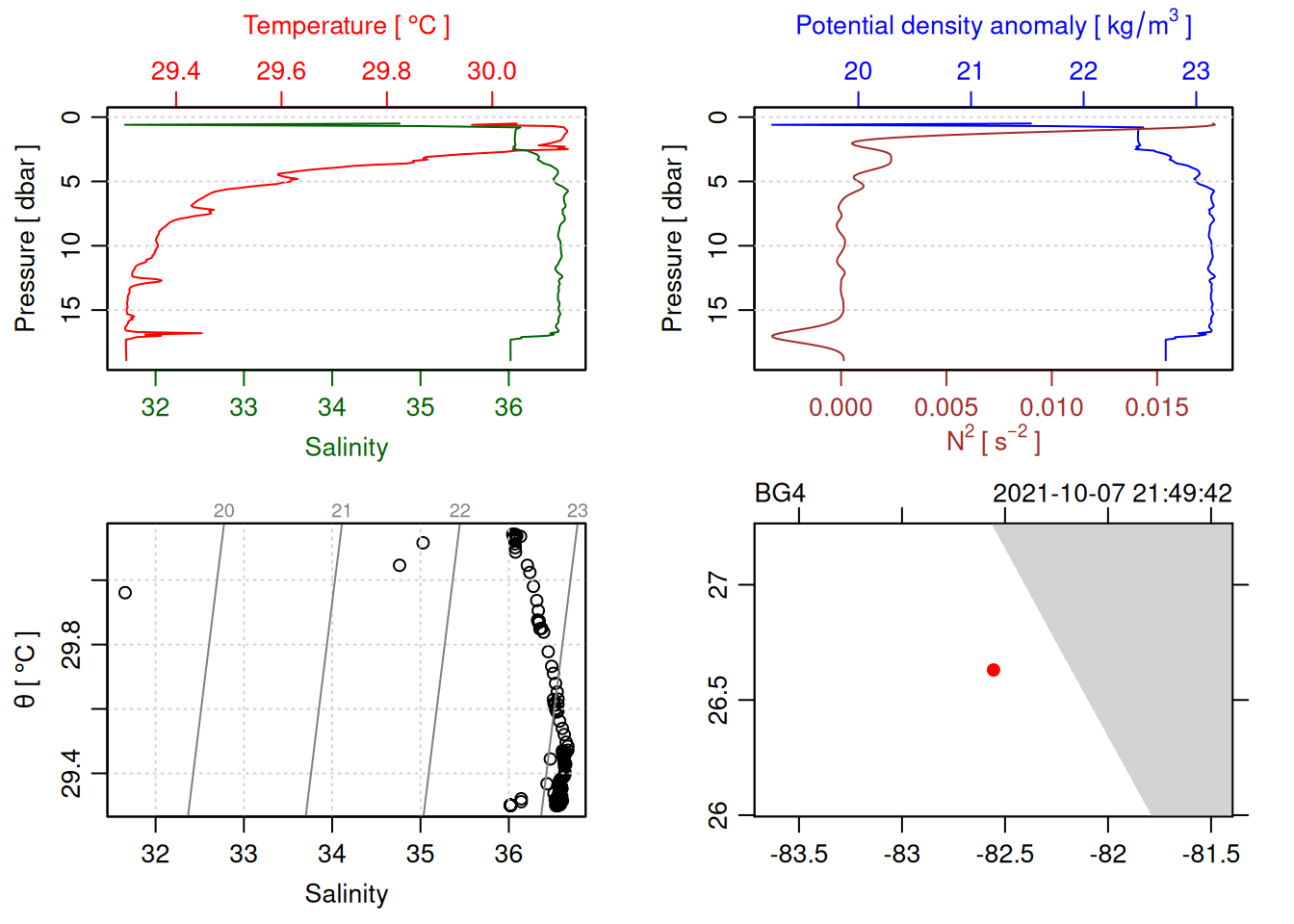 tryCatch({ trimmed_cast <-ctdTrim(cast) decimated_cast <-ctdDecimate(trimmed_cast, p =0.1)# plotting can cause the xlim failureplot(decimated_cast)# === export ===# Get the scan numbers that remain after cleaning cleaned_scans <- decimated_cast@data$scan# Load original raw data to keep all columns ctd_raw <- readr::read_csv(dataFile, show_col_types =FALSE)# Filter raw data to only include the cleaned scans cast_df <- ctd_raw %>%filter(!is.na(sea_water_pressure)) %>%# Remove rows without pressure datamutate(row_num =row_number()) %>%filter(row_num %in% cleaned_scans) %>%select(-row_num)# Add metadata cast_df <-mutate( cast_df,station = station_id,cruise_id = cruise_id )# Check if there are any rows in the cleaned dataif (nrow(cast_df) ==0) {cat("\n=== WARNING: NO DATA AFTER CLEANING ===\n")cat("Cast ID:", params$cast_id, "\n")cat("Station:", station_id, "\n")cat("Cruise:", cruise_id, "\n\n")cat("Raw data rows (with pressure):", sum(!is.na(ctd_raw$sea_water_pressure)), "\n")cat("Cleaned scans to keep:", length(cleaned_scans), "\n")cat("Resulting rows:", nrow(cast_df), "\n\n")cat("Raw data summary:\n")print(summary(ctd_raw[c("sea_water_pressure", "sea_water_temperature", "sea_water_salinity")]))cat("\nCleaned scans (first 20):\n")print(head(cleaned_scans, 20))cat("\n=== CSV FILE NOT CREATED (no data) ===\n\n") } else {# create folder if doesn't exist clean_data_loc <- here::here("data/02_clean")try(fs::dir_create(clean_data_loc))# save ctd to .csv (without row names/indices)write.csv(cast_df, glue("{clean_data_loc}/{params$cast_id}.csv"), row.names =FALSE)cat("Successfully saved", nrow(cast_df), "rows to", glue("{params$cast_id}.csv"), "\n") }}, error =function(e) {cat("\n=== CTD PROCESSING ERROR ===\n")cat("Cast ID:", params$cast_id, "\n")cat("Error message:\n", conditionMessage(e), "\n\n")# Safely inspect objects that might or might not exist when the error happenedif (exists("decimated_cast")) { df <-try(as.data.frame(decimated_cast@data), silent =TRUE)if (!inherits(df, "try-error")) {cat("Dataframe columns:\n")print(names(df))cat("\nSummary of key columns (scan, pressure, temperature, salinity if present):\n") known_cols <-intersect(c("scan", "pressure", "temp", "temperature", "salinity", "conductivity"), names(df))print(summary(df[known_cols], digits =3))cat("\nHead of dataframe:\n")print(head(df)) } else {cat("Could not extract dataframe from decimated_cast.\n") } } else {cat("decimated_cast was never created before the error.\n") }cat("\n=== END ERROR DEBUG INFO ===\n\n")})