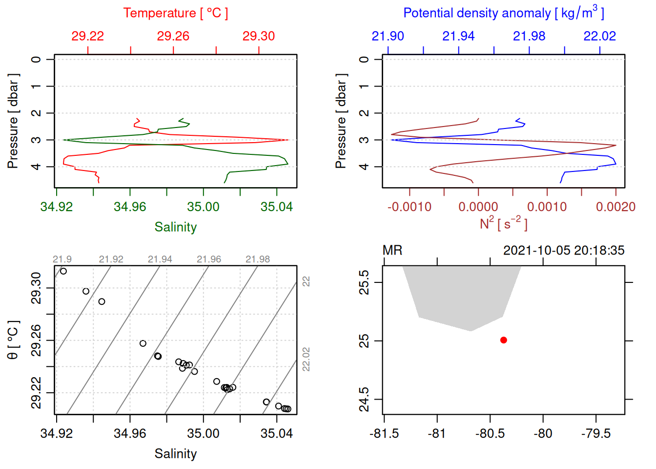 tryCatch({ trimmed_cast <-ctdTrim(cast) decimated_cast <-ctdDecimate(trimmed_cast, p =0.1)# plotting can cause the xlim failureplot(decimated_cast)# === export ===# Get the scan numbers that remain after cleaning cleaned_scans <- decimated_cast@data$scan# Load original raw data to keep all columns ctd_raw <- readr::read_csv(dataFile, show_col_types =FALSE)# Filter raw data to only include the cleaned scans cast_df <- ctd_raw %>%filter(!is.na(sea_water_pressure)) %>%# Remove rows without pressure datamutate(row_num =row_number()) %>%filter(row_num %in% cleaned_scans) %>%select(-row_num)# Add metadata cast_df <-mutate( cast_df,station = station_id,cruise_id = cruise_id )# Check if there are any rows in the cleaned dataif (nrow(cast_df) ==0) {cat("\n=== WARNING: NO DATA AFTER CLEANING ===\n")cat("Cast ID:", params$cast_id, "\n")cat("Station:", station_id, "\n")cat("Cruise:", cruise_id, "\n\n")cat("Raw data rows (with pressure):", sum(!is.na(ctd_raw$sea_water_pressure)), "\n")cat("Cleaned scans to keep:", length(cleaned_scans), "\n")cat("Resulting rows:", nrow(cast_df), "\n\n")cat("Raw data summary:\n")print(summary(ctd_raw[c("sea_water_pressure", "sea_water_temperature", "sea_water_salinity")]))cat("\nCleaned scans (first 20):\n")print(head(cleaned_scans, 20))cat("\n=== CSV FILE NOT CREATED (no data) ===\n\n") } else {# create folder if doesn't exist clean_data_loc <- here::here("data/02_clean")try(fs::dir_create(clean_data_loc))# save ctd to .csv (without row names/indices)write.csv(cast_df, glue("{clean_data_loc}/{params$cast_id}.csv"), row.names =FALSE)cat("Successfully saved", nrow(cast_df), "rows to", glue("{params$cast_id}.csv"), "\n") }}, error =function(e) {cat("\n=== CTD PROCESSING ERROR ===\n")cat("Cast ID:", params$cast_id, "\n")cat("Error message:\n", conditionMessage(e), "\n\n")# Safely inspect objects that might or might not exist when the error happenedif (exists("decimated_cast")) { df <-try(as.data.frame(decimated_cast@data), silent =TRUE)if (!inherits(df, "try-error")) {cat("Dataframe columns:\n")print(names(df))cat("\nSummary of key columns (scan, pressure, temperature, salinity if present):\n") known_cols <-intersect(c("scan", "pressure", "temp", "temperature", "salinity", "conductivity"), names(df))print(summary(df[known_cols], digits =3))cat("\nHead of dataframe:\n")print(head(df)) } else {cat("Could not extract dataframe from decimated_cast.\n") } } else {cat("decimated_cast was never created before the error.\n") }cat("\n=== END ERROR DEBUG INFO ===\n\n")})
