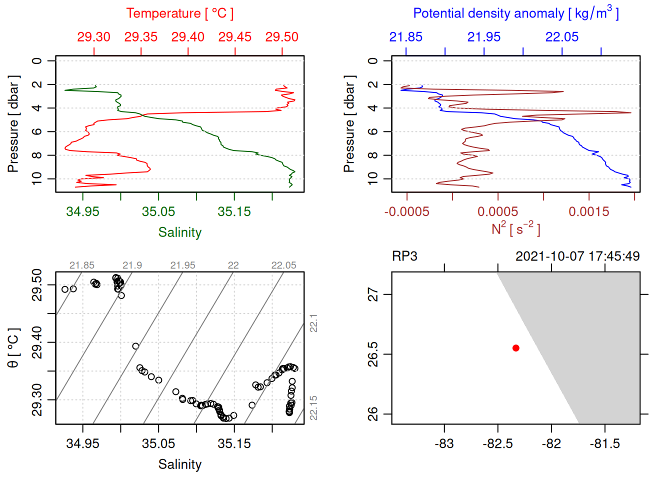 tryCatch({ trimmed_cast <-ctdTrim(cast) decimated_cast <-ctdDecimate(trimmed_cast, p =0.1)# plotting can cause the xlim failureplot(decimated_cast)# === export ===# Get the scan numbers that remain after cleaning cleaned_scans <- decimated_cast@data$scan# Load original raw data to keep all columns ctd_raw <- readr::read_csv(dataFile, show_col_types =FALSE)# Filter raw data to only include the cleaned scans cast_df <- ctd_raw %>%filter(!is.na(sea_water_pressure)) %>%# Remove rows without pressure datamutate(row_num =row_number()) %>%filter(row_num %in% cleaned_scans) %>%select(-row_num)# Add metadata cast_df <-mutate( cast_df,station = station_id,cruise_id = cruise_id )# Check if there are any rows in the cleaned dataif (nrow(cast_df) ==0) {cat("\n=== WARNING: NO DATA AFTER CLEANING ===\n")cat("Cast ID:", params$cast_id, "\n")cat("Station:", station_id, "\n")cat("Cruise:", cruise_id, "\n\n")cat("Raw data rows (with pressure):", sum(!is.na(ctd_raw$sea_water_pressure)), "\n")cat("Cleaned scans to keep:", length(cleaned_scans), "\n")cat("Resulting rows:", nrow(cast_df), "\n\n")cat("Raw data summary:\n")print(summary(ctd_raw[c("sea_water_pressure", "sea_water_temperature", "sea_water_salinity")]))cat("\nCleaned scans (first 20):\n")print(head(cleaned_scans, 20))cat("\n=== CSV FILE NOT CREATED (no data) ===\n\n") } else {# create folder if doesn't exist clean_data_loc <- here::here("data/02_clean")try(fs::dir_create(clean_data_loc))# save ctd to .csv (without row names/indices)write.csv(cast_df, glue("{clean_data_loc}/{params$cast_id}.csv"), row.names =FALSE)cat("Successfully saved", nrow(cast_df), "rows to", glue("{params$cast_id}.csv"), "\n") }}, error =function(e) {cat("\n=== CTD PROCESSING ERROR ===\n")cat("Cast ID:", params$cast_id, "\n")cat("Error message:\n", conditionMessage(e), "\n\n")# Safely inspect objects that might or might not exist when the error happenedif (exists("decimated_cast")) { df <-try(as.data.frame(decimated_cast@data), silent =TRUE)if (!inherits(df, "try-error")) {cat("Dataframe columns:\n")print(names(df))cat("\nSummary of key columns (scan, pressure, temperature, salinity if present):\n") known_cols <-intersect(c("scan", "pressure", "temp", "temperature", "salinity", "conductivity"), names(df))print(summary(df[known_cols], digits =3))cat("\nHead of dataframe:\n")print(head(df)) } else {cat("Could not extract dataframe from decimated_cast.\n") } } else {cat("decimated_cast was never created before the error.\n") }cat("\n=== END ERROR DEBUG INFO ===\n\n")})