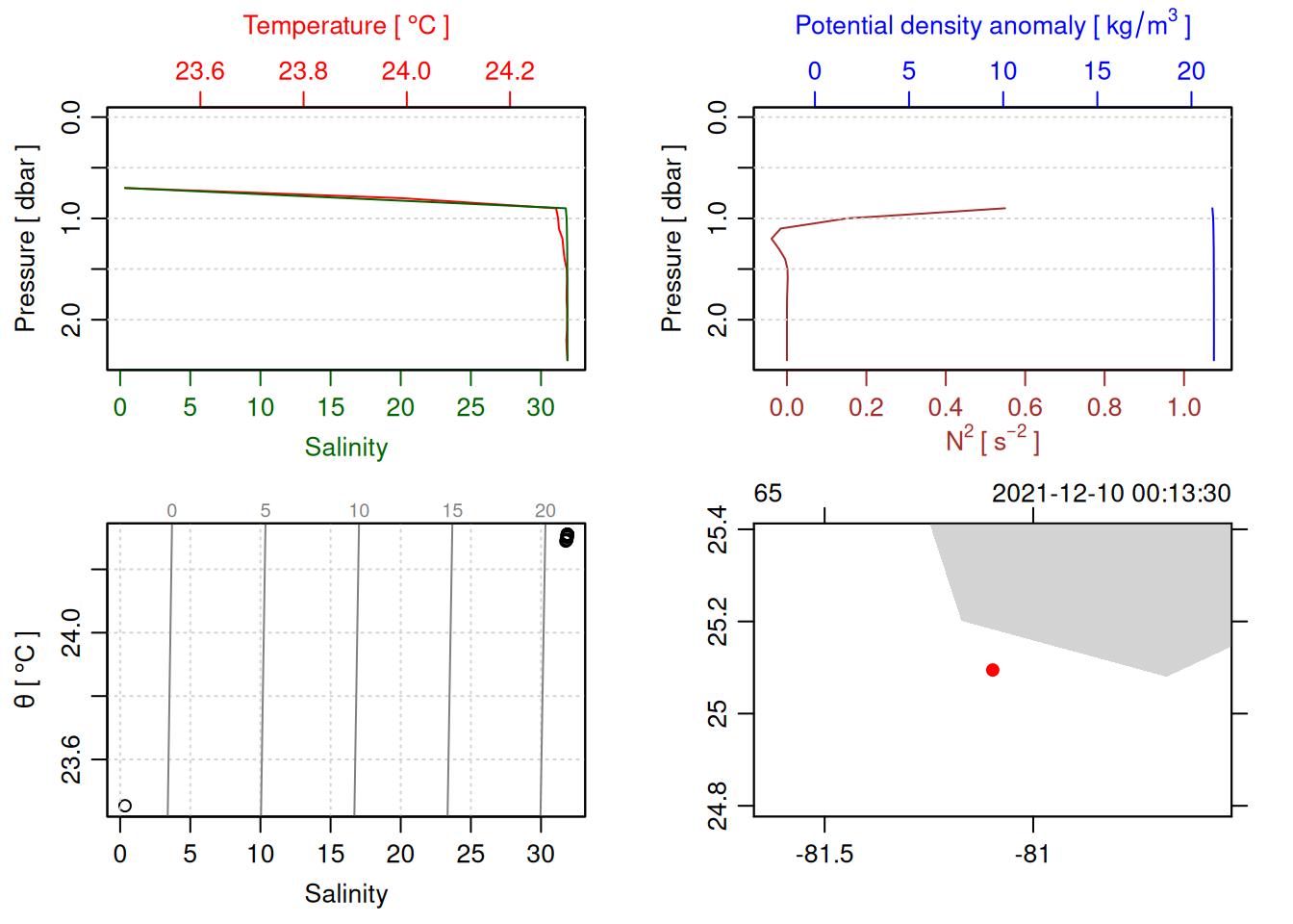 tryCatch({ trimmed_cast <-ctdTrim(cast) decimated_cast <-ctdDecimate(trimmed_cast, p =0.1)# plotting can cause the xlim failureplot(decimated_cast)# === export ===# Get the scan numbers that remain after cleaning cleaned_scans <- decimated_cast@data$scan# Load original raw data to keep all columns ctd_raw <- readr::read_csv(dataFile, show_col_types =FALSE)# Filter raw data to only include the cleaned scans cast_df <- ctd_raw %>%filter(!is.na(sea_water_pressure)) %>%# Remove rows without pressure datamutate(row_num =row_number()) %>%filter(row_num %in% cleaned_scans) %>%select(-row_num)# Add metadata cast_df <-mutate( cast_df,station = station_id,cruise_id = cruise_id )# Check if there are any rows in the cleaned dataif (nrow(cast_df) ==0) {cat("\n=== WARNING: NO DATA AFTER CLEANING ===\n")cat("Cast ID:", params$cast_id, "\n")cat("Station:", station_id, "\n")cat("Cruise:", cruise_id, "\n\n")cat("Raw data rows (with pressure):", sum(!is.na(ctd_raw$sea_water_pressure)), "\n")cat("Cleaned scans to keep:", length(cleaned_scans), "\n")cat("Resulting rows:", nrow(cast_df), "\n\n")cat("Raw data summary:\n")print(summary(ctd_raw[c("sea_water_pressure", "sea_water_temperature", "sea_water_salinity")]))cat("\nCleaned scans (first 20):\n")print(head(cleaned_scans, 20))cat("\n=== CSV FILE NOT CREATED (no data) ===\n\n") } else {# create folder if doesn't exist clean_data_loc <- here::here("data/02_clean")try(fs::dir_create(clean_data_loc))# save ctd to .csv (without row names/indices)write.csv(cast_df, glue("{clean_data_loc}/{params$cast_id}.csv"), row.names =FALSE)cat("Successfully saved", nrow(cast_df), "rows to", glue("{params$cast_id}.csv"), "\n") }}, error =function(e) {cat("\n=== CTD PROCESSING ERROR ===\n")cat("Cast ID:", params$cast_id, "\n")cat("Error message:\n", conditionMessage(e), "\n\n")# Safely inspect objects that might or might not exist when the error happenedif (exists("decimated_cast")) { df <-try(as.data.frame(decimated_cast@data), silent =TRUE)if (!inherits(df, "try-error")) {cat("Dataframe columns:\n")print(names(df))cat("\nSummary of key columns (scan, pressure, temperature, salinity if present):\n") known_cols <-intersect(c("scan", "pressure", "temp", "temperature", "salinity", "conductivity"), names(df))print(summary(df[known_cols], digits =3))cat("\nHead of dataframe:\n")print(head(df)) } else {cat("Could not extract dataframe from decimated_cast.\n") } } else {cat("decimated_cast was never created before the error.\n") }cat("\n=== END ERROR DEBUG INFO ===\n\n")})