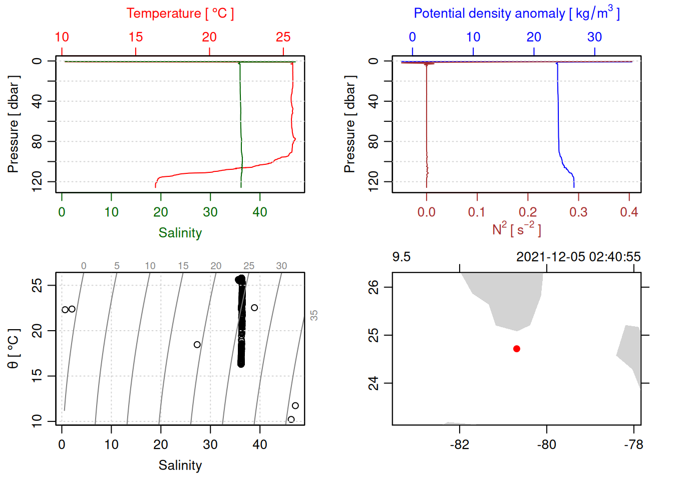 tryCatch({ trimmed_cast <-ctdTrim(cast) decimated_cast <-ctdDecimate(trimmed_cast, p =0.1)# plotting can cause the xlim failureplot(decimated_cast)# === export ===# Get the scan numbers that remain after cleaning cleaned_scans <- decimated_cast@data$scan# Load original raw data to keep all columns ctd_raw <- readr::read_csv(dataFile, show_col_types =FALSE)# Filter raw data to only include the cleaned scans cast_df <- ctd_raw %>%filter(!is.na(sea_water_pressure)) %>%# Remove rows without pressure datamutate(row_num =row_number()) %>%filter(row_num %in% cleaned_scans) %>%select(-row_num)# Add metadata cast_df <-mutate( cast_df,station = station_id,cruise_id = cruise_id )# Check if there are any rows in the cleaned dataif (nrow(cast_df) ==0) {cat("\n=== WARNING: NO DATA AFTER CLEANING ===\n")cat("Cast ID:", params$cast_id, "\n")cat("Station:", station_id, "\n")cat("Cruise:", cruise_id, "\n\n")cat("Raw data rows (with pressure):", sum(!is.na(ctd_raw$sea_water_pressure)), "\n")cat("Cleaned scans to keep:", length(cleaned_scans), "\n")cat("Resulting rows:", nrow(cast_df), "\n\n")cat("Raw data summary:\n")print(summary(ctd_raw[c("sea_water_pressure", "sea_water_temperature", "sea_water_salinity")]))cat("\nCleaned scans (first 20):\n")print(head(cleaned_scans, 20))cat("\n=== CSV FILE NOT CREATED (no data) ===\n\n") } else {# create folder if doesn't exist clean_data_loc <- here::here("data/02_clean")try(fs::dir_create(clean_data_loc))# save ctd to .csv (without row names/indices)write.csv(cast_df, glue("{clean_data_loc}/{params$cast_id}.csv"), row.names =FALSE)cat("Successfully saved", nrow(cast_df), "rows to", glue("{params$cast_id}.csv"), "\n") }}, error =function(e) {cat("\n=== CTD PROCESSING ERROR ===\n")cat("Cast ID:", params$cast_id, "\n")cat("Error message:\n", conditionMessage(e), "\n\n")# Safely inspect objects that might or might not exist when the error happenedif (exists("decimated_cast")) { df <-try(as.data.frame(decimated_cast@data), silent =TRUE)if (!inherits(df, "try-error")) {cat("Dataframe columns:\n")print(names(df))cat("\nSummary of key columns (scan, pressure, temperature, salinity if present):\n") known_cols <-intersect(c("scan", "pressure", "temp", "temperature", "salinity", "conductivity"), names(df))print(summary(df[known_cols], digits =3))cat("\nHead of dataframe:\n")print(head(df)) } else {cat("Could not extract dataframe from decimated_cast.\n") } } else {cat("decimated_cast was never created before the error.\n") }cat("\n=== END ERROR DEBUG INFO ===\n\n")})