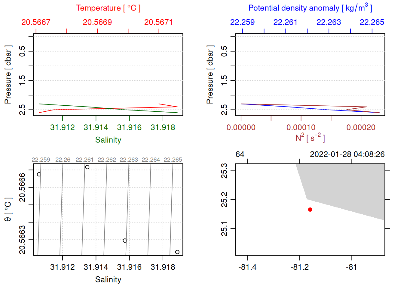 tryCatch({ trimmed_cast <-ctdTrim(cast) decimated_cast <-ctdDecimate(trimmed_cast, p =0.1)# plotting can cause the xlim failureplot(decimated_cast)# === export ===# Get the scan numbers that remain after cleaning cleaned_scans <- decimated_cast@data$scan# Load original raw data to keep all columns ctd_raw <- readr::read_csv(dataFile, show_col_types =FALSE)# Filter raw data to only include the cleaned scans cast_df <- ctd_raw %>%filter(!is.na(sea_water_pressure)) %>%# Remove rows without pressure datamutate(row_num =row_number()) %>%filter(row_num %in% cleaned_scans) %>%select(-row_num)# Add metadata cast_df <-mutate( cast_df,station = station_id,cruise_id = cruise_id )# Check if there are any rows in the cleaned dataif (nrow(cast_df) ==0) {cat("\n=== WARNING: NO DATA AFTER CLEANING ===\n")cat("Cast ID:", params$cast_id, "\n")cat("Station:", station_id, "\n")cat("Cruise:", cruise_id, "\n\n")cat("Raw data rows (with pressure):", sum(!is.na(ctd_raw$sea_water_pressure)), "\n")cat("Cleaned scans to keep:", length(cleaned_scans), "\n")cat("Resulting rows:", nrow(cast_df), "\n\n")cat("Raw data summary:\n")print(summary(ctd_raw[c("sea_water_pressure", "sea_water_temperature", "sea_water_salinity")]))cat("\nCleaned scans (first 20):\n")print(head(cleaned_scans, 20))cat("\n=== CSV FILE NOT CREATED (no data) ===\n\n") } else {# create folder if doesn't exist clean_data_loc <- here::here("data/02_clean")try(fs::dir_create(clean_data_loc))# save ctd to .csv (without row names/indices)write.csv(cast_df, glue("{clean_data_loc}/{params$cast_id}.csv"), row.names =FALSE)cat("Successfully saved", nrow(cast_df), "rows to", glue("{params$cast_id}.csv"), "\n") }}, error =function(e) {cat("\n=== CTD PROCESSING ERROR ===\n")cat("Cast ID:", params$cast_id, "\n")cat("Error message:\n", conditionMessage(e), "\n\n")# Safely inspect objects that might or might not exist when the error happenedif (exists("decimated_cast")) { df <-try(as.data.frame(decimated_cast@data), silent =TRUE)if (!inherits(df, "try-error")) {cat("Dataframe columns:\n")print(names(df))cat("\nSummary of key columns (scan, pressure, temperature, salinity if present):\n") known_cols <-intersect(c("scan", "pressure", "temp", "temperature", "salinity", "conductivity"), names(df))print(summary(df[known_cols], digits =3))cat("\nHead of dataframe:\n")print(head(df)) } else {cat("Could not extract dataframe from decimated_cast.\n") } } else {cat("decimated_cast was never created before the error.\n") }cat("\n=== END ERROR DEBUG INFO ===\n\n")})