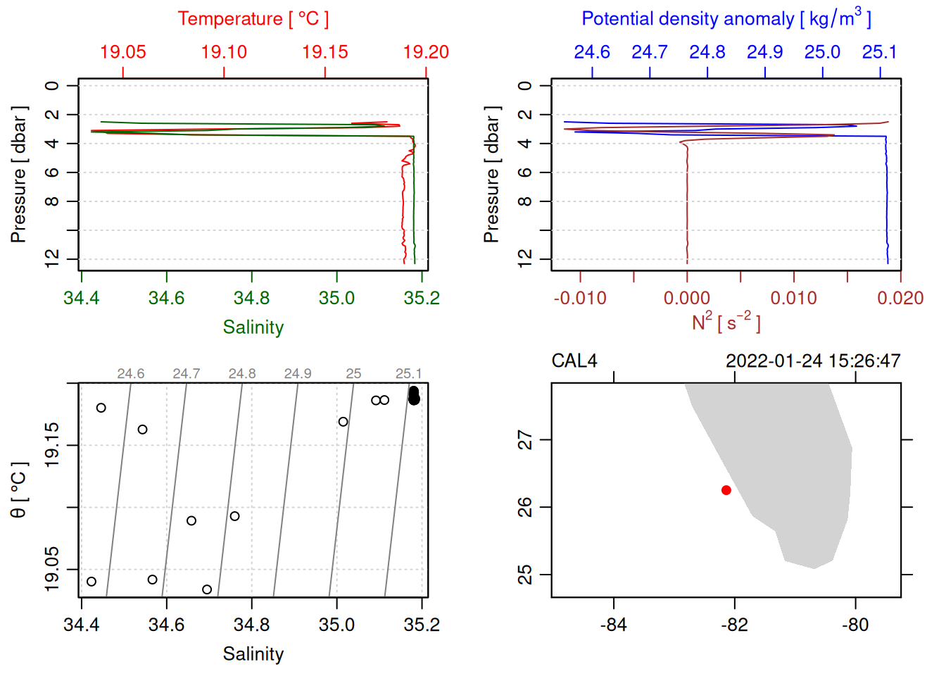 tryCatch({ trimmed_cast <-ctdTrim(cast) decimated_cast <-ctdDecimate(trimmed_cast, p =0.1)# plotting can cause the xlim failureplot(decimated_cast)# === export ===# Get the scan numbers that remain after cleaning cleaned_scans <- decimated_cast@data$scan# Load original raw data to keep all columns ctd_raw <- readr::read_csv(dataFile, show_col_types =FALSE)# Filter raw data to only include the cleaned scans cast_df <- ctd_raw %>%filter(!is.na(sea_water_pressure)) %>%# Remove rows without pressure datamutate(row_num =row_number()) %>%filter(row_num %in% cleaned_scans) %>%select(-row_num)# Add metadata cast_df <-mutate( cast_df,station = station_id,cruise_id = cruise_id )# Check if there are any rows in the cleaned dataif (nrow(cast_df) ==0) {cat("\n=== WARNING: NO DATA AFTER CLEANING ===\n")cat("Cast ID:", params$cast_id, "\n")cat("Station:", station_id, "\n")cat("Cruise:", cruise_id, "\n\n")cat("Raw data rows (with pressure):", sum(!is.na(ctd_raw$sea_water_pressure)), "\n")cat("Cleaned scans to keep:", length(cleaned_scans), "\n")cat("Resulting rows:", nrow(cast_df), "\n\n")cat("Raw data summary:\n")print(summary(ctd_raw[c("sea_water_pressure", "sea_water_temperature", "sea_water_salinity")]))cat("\nCleaned scans (first 20):\n")print(head(cleaned_scans, 20))cat("\n=== CSV FILE NOT CREATED (no data) ===\n\n") } else {# create folder if doesn't exist clean_data_loc <- here::here("data/02_clean")try(fs::dir_create(clean_data_loc))# save ctd to .csv (without row names/indices)write.csv(cast_df, glue("{clean_data_loc}/{params$cast_id}.csv"), row.names =FALSE)cat("Successfully saved", nrow(cast_df), "rows to", glue("{params$cast_id}.csv"), "\n") }}, error =function(e) {cat("\n=== CTD PROCESSING ERROR ===\n")cat("Cast ID:", params$cast_id, "\n")cat("Error message:\n", conditionMessage(e), "\n\n")# Safely inspect objects that might or might not exist when the error happenedif (exists("decimated_cast")) { df <-try(as.data.frame(decimated_cast@data), silent =TRUE)if (!inherits(df, "try-error")) {cat("Dataframe columns:\n")print(names(df))cat("\nSummary of key columns (scan, pressure, temperature, salinity if present):\n") known_cols <-intersect(c("scan", "pressure", "temp", "temperature", "salinity", "conductivity"), names(df))print(summary(df[known_cols], digits =3))cat("\nHead of dataframe:\n")print(head(df)) } else {cat("Could not extract dataframe from decimated_cast.\n") } } else {cat("decimated_cast was never created before the error.\n") }cat("\n=== END ERROR DEBUG INFO ===\n\n")})